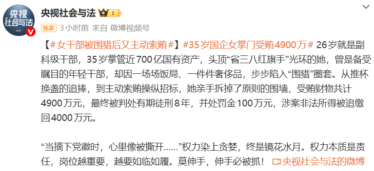 案件概述 - 涉案人员鞠某曾为年轻干部,26岁任副科级,35岁掌管近700亿国有资产,并曾获“省三八红旗手”称号 [1] - 鞠某因参与饭局、收受奢侈品等逐步陷入“围猎”,从被追捧发展到主动索贿并操纵招标 [1][3] - 其受贿财物总计4900万元,最终被判处有期徒刑8年,并处罚金100万元,涉案非法所得被追缴4000万元 [3] 涉案金额与资产 - 鞠某在35岁时掌管的国有资产规模近700亿元 [1] - 经查实的受贿财物总额为4900万元 [3] - 法院判决追缴的非法所得为4000万元 [3] 案件影响与警示 - 案件揭示了权力与贪婪结合导致的后果,鞠某在庭审中表示“当摘下党徽时,心里像被撕开” [3] - 该案例强调权力本质是责任,岗位越重要越需谨慎,并发出“莫伸手,伸手必被抓”的警示 [3]