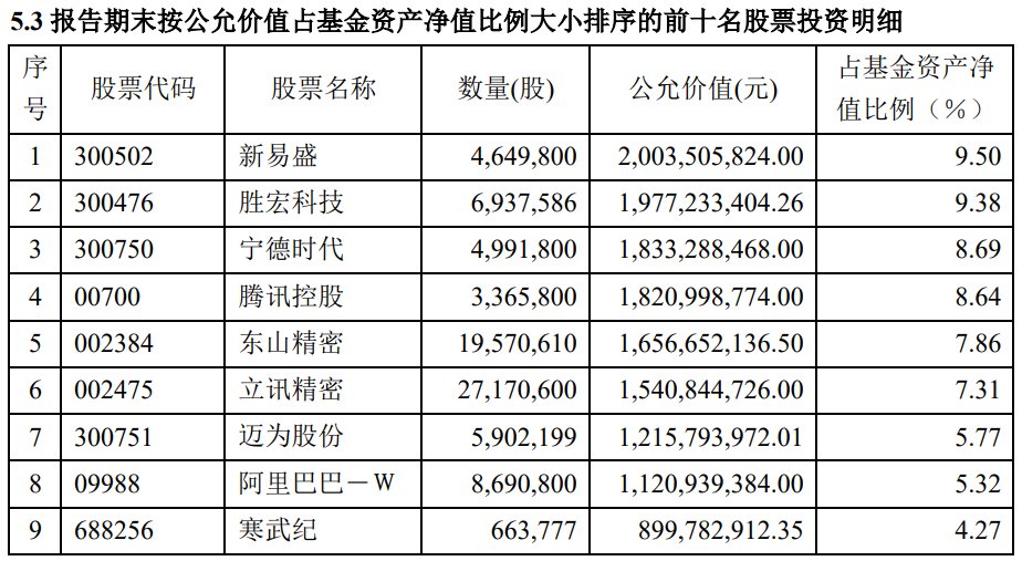 睿远基金2025年四季度持仓变动与投资策略 - 睿远成长价值混合基金在2025年四季度加仓了寒武纪[1] - 该基金同期减仓了新易盛、阿里巴巴-W、东山精密等个股[1] - 基金前十大持仓中,移动运营商个股配置被移除,取而代之的是四季度表现突出的光伏和半导体高端设备制造商[1] - 基金计划在2026年一季度,在突出板块和个股配置的基础上,尽量减少投资的不确定性[1] 睿远成长价值混合基金前十大持仓明细 - 截至报告期末,基金前十大重仓股按占基金资产净值比例排序为:新易盛(9.50%)、胜宏科技(9.38%)、宁德时代(8.69%)、腾讯控股(8.64%)、东山精密(7.86%)、立讯精密(7.31%)、迈为股份(5.77%)、阿里巴巴-W(5.32%)、寒武纪(4.27%)、巨星科技(3.64%)[2] - 睿远成长价值混合A基金份额净值为1.9685元,报告期内份额净值增长率为0.57%,同期业绩比较基准收益率为-1.37%[2] - 睿远成长价值混合C基金份额净值为1.9159元,报告期内份额净值增长率为0.47%,同期业绩比较基准收益率为-1.37%[2] 睿远成长价值混合基金经理投资操作与行业观点 - 基金经理为2026年组合做准备,减持了基本面趋势偏弱的公司[3] - 增加了数据中心液冷、存力和算力的相关公司配置,基于对行业发展态势及个股研究的判断[3] - 持续看好光模块、PCB材料、芯片、数据中心液冷等板块及个股的未来发展,并计划在2026年加大研究力度[3] 睿远均衡价值三年持有混合基金持仓与业绩 - 基金经理赵枫管理的睿远均衡价值三年持有混合基金股票仓位已攀升至近三年最高水平[3] - 该基金重新买回了美的集团,华润万象生活、格力电器新进其持仓前十[3] - 该基金减仓了立讯精密,阿里巴巴-W、分众传媒则退出了前十大重仓股[3] - 睿远均衡价值三年持有混合A基金份额净值为1.7064元,报告期内份额净值增长率为-0.26%,同期业绩比较基准收益率为-1.52%[4] - 睿远均衡价值三年持有混合C基金份额净值为1.6767元,报告期内份额净值增长率为-0.33%,同期业绩比较基准收益率为-1.52%[4] 睿远均衡价值三年持有混合基金经理宏观与配置观点 - 基金经理认为宏观周期正向有利权益资产的方向变化,中国经济有望逐步走出通缩预期,企业盈利质量将逐步改善[4] - 具备定价权和成本转嫁能力的行业龙头更为受益,资本市场改革持续推进,长期资金入市环境逐步优化[4] - 投资仍将聚焦基本面扎实、竞争壁垒深厚的企业,通过结构性配置获取超额回报[4] - 具体配置上,关注处于快速海外扩张的国内龙头企业,这些公司在产品品质、创新和价格竞争力上已不输海外龙头[4] - 预计未来五到十年,海外收入增长将成为驱动这批公司业绩增长的主要动力[4]