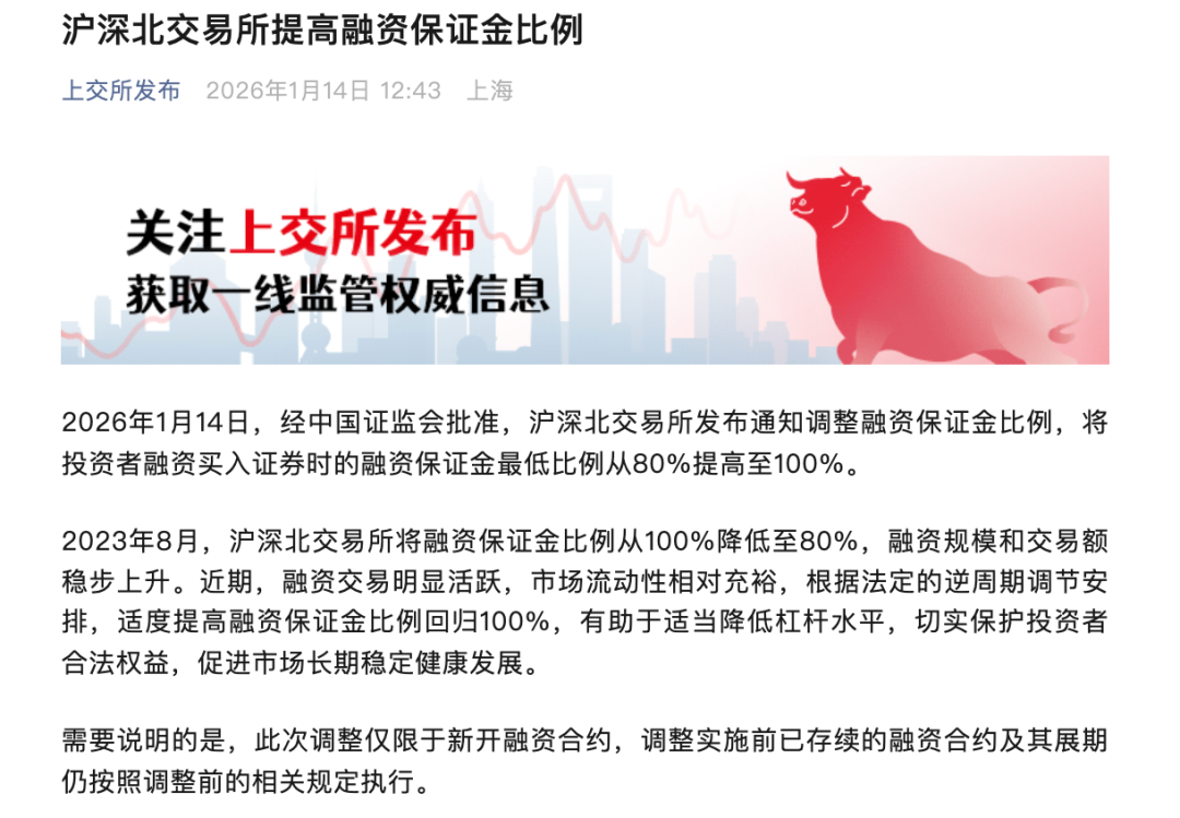 交易所融资保证金政策调整 - 沪深北交易所于2023年8月将融资保证金比例从100%降低至80%,此后融资规模和交易额稳步上升 [2] - 近期融资交易明显活跃,市场流动性相对充裕,交易所根据逆周期调节安排,将融资保证金比例适度提高回归至100% [2] - 此次调整仅限于新开融资合约,调整实施前已存续的融资合约及其展期仍按原规定执行 [2] 市场整体表现与交易数据 - 截至1月14日午间收盘,上证指数上涨1.20%至4188.24点,深证成指上涨1.98%至14449.57点,创业板指上涨2.24%至3396.35点 [2][3] - 1月14日全市场4700余只个股上涨,全市场成交额为2.25万亿元 [2] - 1月9日至13日,A股市场日成交额已连续三日突破3万亿元,并刷新历史最高日成交纪录 [2] - 1月14日万得全A指数上涨1.89%至6900.67点,预测成交额为3.50万亿元,较前缩量2023亿元 [3] 主要指数表现详情 - 科创综指上涨3.55%至1870.20点,北证50指数上涨2.96%至1611.99点 [3] - 沪深300指数上涨1.08%至4812.48点,中证500指数上涨2.67%至8360.89点 [3] - 中证1000指数上涨2.53%至8410.43点,深证100指数上涨1.38%至6000.77点 [3] - 中证A500指数上涨1.52%至5990.97点,中证红利指数上涨0.39%至5613.55点 [3] 行业与板块表现 - 行业方面,互联网、软件、文化传媒等涨幅居前 [2] - AI应用板块继续走强 [2]