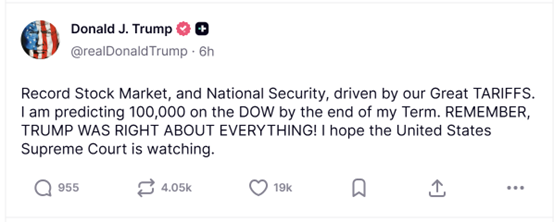 特朗普对股市的预测与归因 - 核心观点:特朗普预计在2029年1月其任期结束前,道琼斯工业平均指数将达到10万点,并将美股近期上涨归功于其推行的关税政策[1] - 特朗普将道指突破5万点的里程碑归功于自己,并称比预期提前了三年达成目标[2] - 特朗普称标普500指数的下跌与其执政以来的累计涨幅相比“不值一提”[2] 关税政策的观点与争议 - 特朗普宣称其推行的关税政策驱动了创纪录的股市与国家安全[1] - 特朗普提及美国最高法院即将就一项有关对等关税合法性的案件作出裁决,该法院近期已就其拥有的广泛关税权力是否符合宪法展开辩论[1] - 有观点指出,关税成本大部分由美国消费者和企业承担,基尔世界经济研究所上个月发布的一项研究显示,约96%的关税成本由美国人承担[1] 市场预期与机构共识的差异 - 特朗普的乐观预期与机构共识存在明显差异,华尔街分析师对今年标普500指数的中位数预测涨幅仅约11%[2]