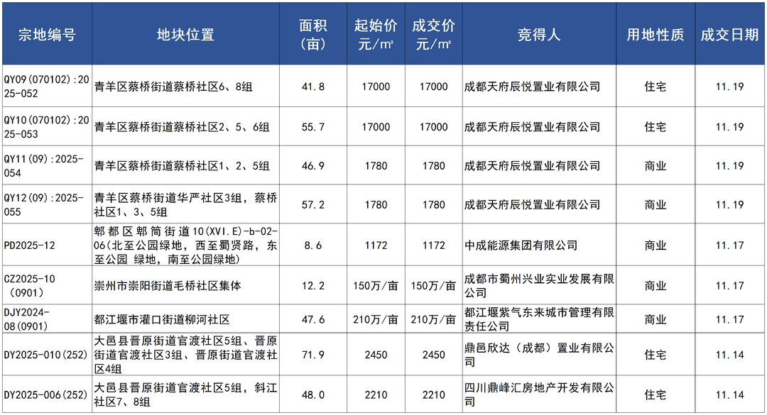 每周四,封面天天见之"封面会买房"都会带来最新楼市资讯与行业观察,敬请关注。 从上周四到本周三(11月13日-11月19日),哪些楼市动态值得重点关注?来看本周楼市周报。 一、土地市场 本周(11月13日-11月19日)大成都范围内共成交9宗住宅、商业用地,面积合计约389.9亩,所有地块均为底价成交。其中青羊区四宗地块采用"组合供应 方式"出让。其中住宅用地合计约97.5亩,成交楼面价17000元/㎡。商服用地合计约104.2,成交楼面价1780元/㎡。最终均由成都天府辰悦置业有限公司底 价竞得,该公司为大悦城控股集团股份有限公司的附属企业。意味着青羊大悦城项目正式落地蔡桥板块。 | 宗地编号 | 地块位置 | 面积 | 起始价 | 成交价 | 竞得人 | 用地性质 | 成交日期 | | --- | --- | --- | --- | --- | --- | --- | --- | | | | (亩) | 元/m² | 元/m² | | | | | QY09 (070102) : 20 | 青羊区蔡桥街道蔡桥社区6、8组 | 41.8 | 17000 | 17000 | 成都天府辰悅置业有限公司 | 住宅 ...