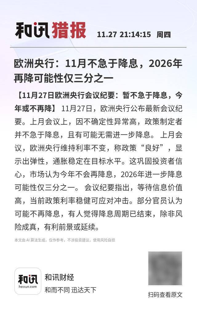 【11月27日欧洲央行会议纪要:暂不急于降息,今 年或不再降】11月27日,欧洲央行公布最新会议纪 要。上月会议上,因不确定性异常高,政策制定者 并不急于降息,且有可能无需进一步降息。上月会 议,欧洲央行维持利率不变,称政策"良好",显 示出弹性,通胀稳定在目标水平。这巩固投资者信 心,市场认为今年不会再降息,2026年进一步降息 可能性仅三分之一。会议纪要指出,等待信息价值 高,当前政策利率稳健可应对冲击。部分官员认为 可能不再降息,有人觉得降息周期已结束,除非风 险成真,有利前景或延续。 本文由 Al 算法生成,仅作参考,不涉投资建议,使用风险自担 和讯财经 和而不同 迅达天下 【11月27日欧洲央行会议纪要:暂不急于降息,今年或不再降】11月27日,欧洲央行公布最新会议纪 要。上月会议上,因不确定性异常高,政策制定者并不急于降息,且有可能无需进一步降息。 上月会 议,欧洲央行维持利率不变,称政策"良好",显示出弹性,通胀稳定在目标水平。这巩固投资者信心, 市场认为今年不会再降息,2026年进一步降息可能性仅三分之一。 会议纪要指出,等待信息价值高, 当前政策利率稳健可应对冲击。部分官员认为可能不再降息, ...