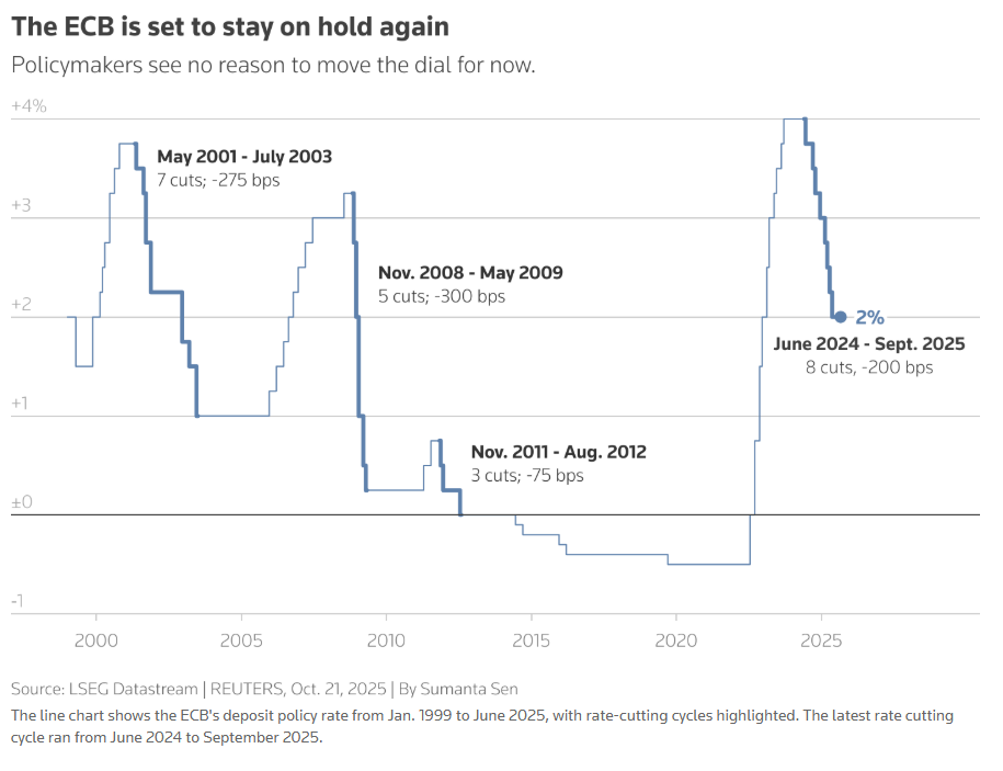 欧洲央行近期货币政策行动预期 - 利率期货市场交易员普遍预期欧洲央行将在10月30日的利率决议上宣布继续按兵不动,维持基准利率在2%不变,这将是连续第三次货币政策会议暂停降息步伐[1][2] - 市场定价显示欧洲央行在本次会议上按兵不动的概率非常高,这一预期自9月以来几乎没有变化[1][2] - 本次会议被视为过渡性会议,更重要的货币政策会议将在12月中旬举行[2] 欧元区通胀前景分析 - 9月欧元区通胀率意外升至2.2%,为4月以来首次高于央行锚定的2%目标,主要原因是服务价格上涨且能源成本下滑放缓[6] - 欧洲央行决策者最新立场显示并不担心通胀将持续高于2%目标,预计整体通胀将在明年降至1.7%,并在2027年年中之前保持在2%以下[6] - 货币政策决策者更担忧通胀走弱的风险而非通胀持续走强,短期通胀风险偏下行,原因在于更强势的欧元以及来自亚洲出口的通缩冲击[6] 2026年降息预期变化 - 交易员对2026年降息预期的押注出现反复拉锯,本月早些时候因美国宣布额外关税政策,市场定价约有80%概率在2026年再度开启降息周期[9] - 随着欧元区经济数据显现增长动能以及中美贸易协议积极迹象,交易员再次降低了2026年重启降息周期的押注[9] - 利率期货交易员目前预计到2026年底欧洲央行重启降息周期的概率略低于50%[13] 经济不确定性对货币政策的影响 - 经济下行风险将强化“略低”利率的理由,而上行因素则支持欧洲央行按兵不动[14] - 美国关税政策影响及贸易紧张局势可能升级是欧元区经济面临的主要下行风险,欧元汇率进一步走强以及德国刺激落地慢于预期也可能促使欧洲央行再次重启降息[14] - 人工智能驱动的股市估值抬升提高了全球金融市场突然重定价的风险,这可能损及欧元区经济[14] 俄罗斯资产问题与欧元地位 - 在利用被冻结俄罗斯资产援助乌克兰的讨论中,欧洲央行不希望欧元这一主权货币的信誉受到损害[18] - 一些欧盟成员国政府提议将俄罗斯现金资产投资于欧盟发行的零息债券,用所得收益向乌克兰提供贷款支持,但此想法已被搁置至12月再讨论[18] - 国防军工防务能力以及欧元区资本市场的有限深度等因素,对欧元作为全球储备货币地位的决定性作用更大[18]