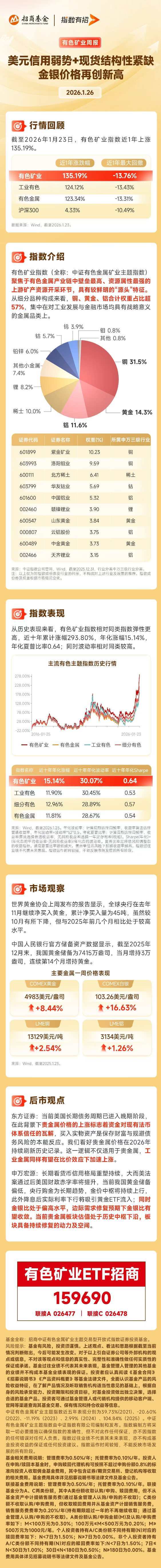 贵金属及有色金属市场行情 - 2025年1月27日,现货黄金突破5070美元/盎司,日内上涨1.24% [1] - 沪银主力合约上涨超过6%,现货白银上涨超过5%,纽约期银上涨超过5%并突破109美元/盎司 [1] - 截至2025年1月23日,COMEX黄金价格为4983美元/盎司,周涨幅为16.63%;COMEX白银价格为103.26美元/盎司,周涨幅为8.44% [11] - 同期LME铜价格为13129美元/吨,周涨幅为1.26%;LME铝价格为3134美元/吨,周涨幅为2.54% [11] 机构核心观点 - 东方证券认为,当前美国长期债务周期已进入晚期阶段,贵金属价格上涨标志着资金对现有法币体系信任的瓦解,买入实物资产是保存财富与规避债务风险的本能反应 [1][13] - 该机构看好贵金属价格在2026年持续刷新历史记录,并认为这一逻辑也适用于工业金属,工业金属有望在比价效应下加速上涨 [1][13] - 申万宏源认为,长期看货币信用格局重塑持续,美国“大而美”法案通过后财政赤字率将提升,同时中国央行购金为长期趋势,金价中枢将持续上行 [14] - 该机构还指出,降息后实际利率下行将吸引黄金ETF流入,且当前金银比处于偏高水平,在边际需求修复预期下有望收敛 [14] - 申万宏源认为当前贵金属板块估值处于历史中枢下沿,板块具备持续修复的动力及空间 [14] 中证有色金属矿业主题指数概况 - 该指数聚焦于有色金属产业链中壁垒最高、资源属性最强的上游矿产资源开采环节,具有鲜明的“源头”特征 [3] - 从细分品种构成看,铜、黄金、铝合计权重占比超过57% [3] - 具体权重分布为:铜31.5%,黄金14.3%,铝11.6%,稀土10.0%,锂8.2%,铅锌6.0%,钴5.7%,钨3.9%,其他小金属7.4%,其他0.8% [4][5] - 前十大成分股及权重为:紫金矿业(10.23%)、洛阳钼业(9.59%)、北方稀土(6.41%)、华友钴业(5.69%)、中国铝业(5.32%)、赣锋锂业(3.90%)、山东黄金(3.84%)、云铝股份(3.75%)、中金黄金(3.73%)、天齐锂业(3.15%) [6] 指数历史表现 - 有色矿业指数近十年累计涨幅为293.80%,年化涨幅为15.14%,年化夏普比率为0.64,年化波动率为30.07% [7][9] - 其表现优于其他主流有色主题指数:工业有色指数年化涨幅11.90%,细分有色指数年化涨幅12.96%,有色金属指数年化涨幅11.81% [9] - 该指数近五年年度表现分别为:2021年39.73%,2022年-20.60%,2023年-11.19%,2024年2.99%,2025年104.84% [17] 市场与政策动态 - 世界黄金协会报告显示,全球央行在2025年11月继续净买入黄金,累计净买入量为45吨,虽然较10月有所下降,但与2025年前几个月相比处于较高水平 [10] - 中国人民银行官方储备资产数据显示,截至2025年12月末,中国黄金储备为7415万盎司,当月增持3万盎司,为连续第14个月增持黄金 [10]