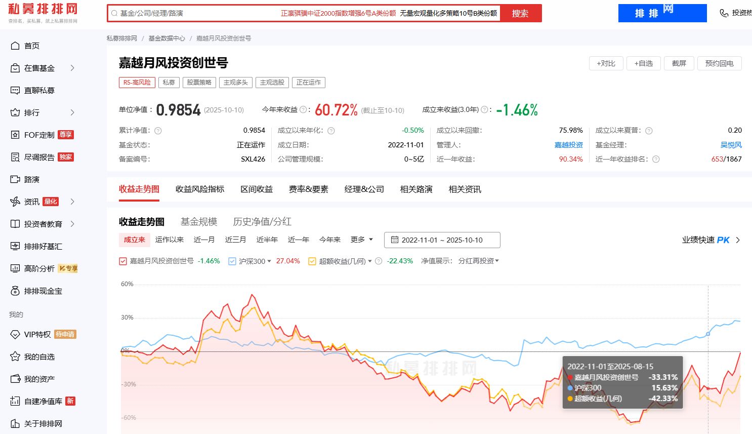 产品表现 - 嘉越月风投资创世号产品净值在近期一周内飙升20%,今年以来收益率达到60.72%,截至10月10日单位净值为0.9854元 [1] - 该产品净值曾经历大幅下跌,在今年4月3日跌破0.4元,按此低点计算,近半年多来涨幅高达156% [1] - 产品净值自4月以来呈现强劲反弹,4月上涨24.63%,5月上涨7.4%,6月上涨37.52%,7月上涨7.54%,9月上涨22.26%,10月以来上涨20.23%,仅在8月下跌10.99% [2] 产品规模 - 产品初始规模约为2200万元人民币,高峰期规模曾超过1.5亿元 [2] - 伴随净值反弹,产品管理规模从4月3日的2538.32万元增长至10月10日的6654.90万元 [2] 投资策略与市场分析 - 市场分析认为其净值大幅反弹可能与投资A股“妖股”、比特币或比特币概念股、或特斯拉有关 [2] - 有分析指出产品净值走势与比特币概念股Coinbase同步,例如6月产品上涨近38%而Coinbase同期上涨42% [2] - 市场观点认为私募基金经理的投资策略、风险控制和市场判断存在差异,市场分化明显时不同策略会迎来适合自身的行情 [3]