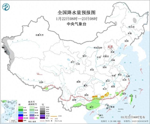 1月22日夜间至24日,新疆西部、西藏西南部的部分地区有中到大雪,局地有暴雪或大暴雪。期间,青 藏高原自西向东将出现小到中雪,降雪过后气温下降6~8℃,局地可超过10℃。 国内未来三天具体预报 1月22日08时至23日08时,新疆南疆西部山区、西藏西部等地部分地区有小到中雪,其中,新疆南疆西 部山区部分地区有大到暴雪(10~12毫米)。湖南南部、广西西北部等地局地有冻雨。云南东南部、广西 中东部、福建中部、台湾岛中东部等地部分地区有小雨,其中,台湾岛东部局地有中雨。辽东半岛部分 地区有4~6级风,西藏北部部分地区有5~7级风;黄海、东海、台湾海峡、台湾以东洋面、巴士海峡、 北部湾、南海大部海域将有5~7级风、阵风8级。 全国降水量预报图(1月22日08时-23日08时) 1月23日08时至24日08时,新疆西部、西藏西部等地部分地区有小到中雪或雨夹雪,其中,新疆南疆西 部山区、西藏西部等地部分地区有大到暴雪,局地大暴雪(20~28毫米)。云南南部、海南岛东部、台湾 中新网1月22日电 据中央气象台网站消息,昨日,安徽、湖北、湖南、江西等地出现降雪或雨夹雪天 气,湖南、贵州出现冻雨。预计22日,湖南和广西等地有 ...