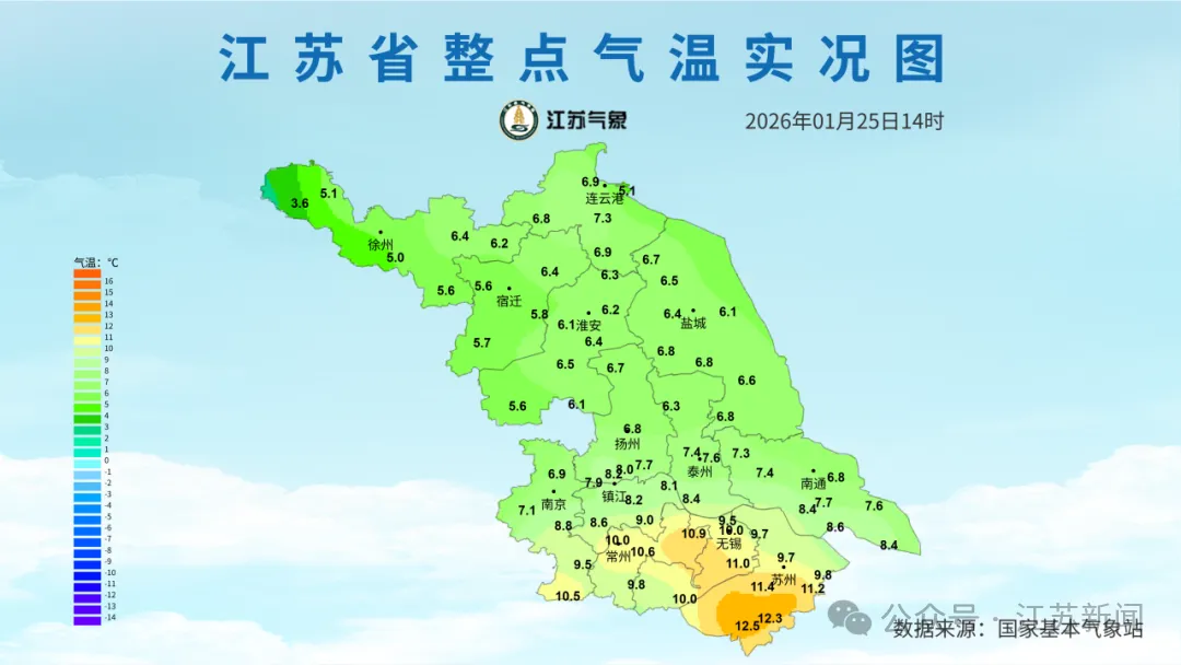 天气事件概述 - 江苏地区自1月25日夜间起将经历一次雨雪、降温及弱冷空气影响过程 [1][3] - 主要降水时段为1月25日夜间至26日,全省阴有小雨,淮北北部地区(徐州、连云港)可能出现小雨或小雨夹雪 [3][5] - 1月26日至27日有一次弱冷空气影响,全省风力达4-5级 [3][5] 温度变化趋势 - 1月26日最高温度:沿江和苏南地区7°C左右,其他地区4~5°C [5] - 1月26日最低温度:淮北地区1°C左右,沿江和苏南地区4~5°C,其他地区2~3°C [5] - 1月27日20时后,气温进一步下降,淮北地区最低温度达-3°C左右,苏南地区3°C左右,其他地区0~-1°C [8] - 1月28日,沿淮和淮北地区最低温度-2~-3°C,苏南地区2~3°C,其他地区0~-1°C [12] 各市未来五天最高气温预报 - 南京:26日7°C,27日9°C,28日9°C,29日9°C,30日7°C [13] - 无锡:26日8°C,27日9°C,28日9°C,29日10°C,30日6°C [13] - 徐州:26日6°C,27日7°C,28日7°C,29日7°C,30日5°C [13] - 苏州:26日9°C,27日8°C,28日8°C,29日11°C,30日7°C [13] - 连云港:26日5°C,27日5°C,28日7°C,29日8°C,30日4°C [13] 1月26日各市具体天气与温度 - 南京:阴有小雨,4°C ~ 7°C [17] - 无锡:阴有小雨,5°C ~ 8°C [17] - 徐州:阴有小雨转小雨夹雪或小雪,-1°C ~ 6°C [17] - 常州:阴有小到中雨转小雨渐止,5°C ~ 7°C [17] - 苏州:阴有小雨渐止,6°C ~ 9°C [17] - 连云港:阴有小雨或雨夹雪渐止,1°C ~ 6°C [17] - 淮安:阴有小雨渐止,2°C ~ 4°C [17] - 盐城:阴有小雨渐止,2°C ~ 5°C [17] - 扬州:阴有小雨,3°C ~ 6°C [18] - 镇江:阴转小雨并渐止,4°C ~ 7°C [18] - 泰州:阴有小雨转多云,3°C ~ 6°C [18] - 宿迁:阴有小雨或小雨夹雪渐止转多云,1°C ~ 3°C [18]