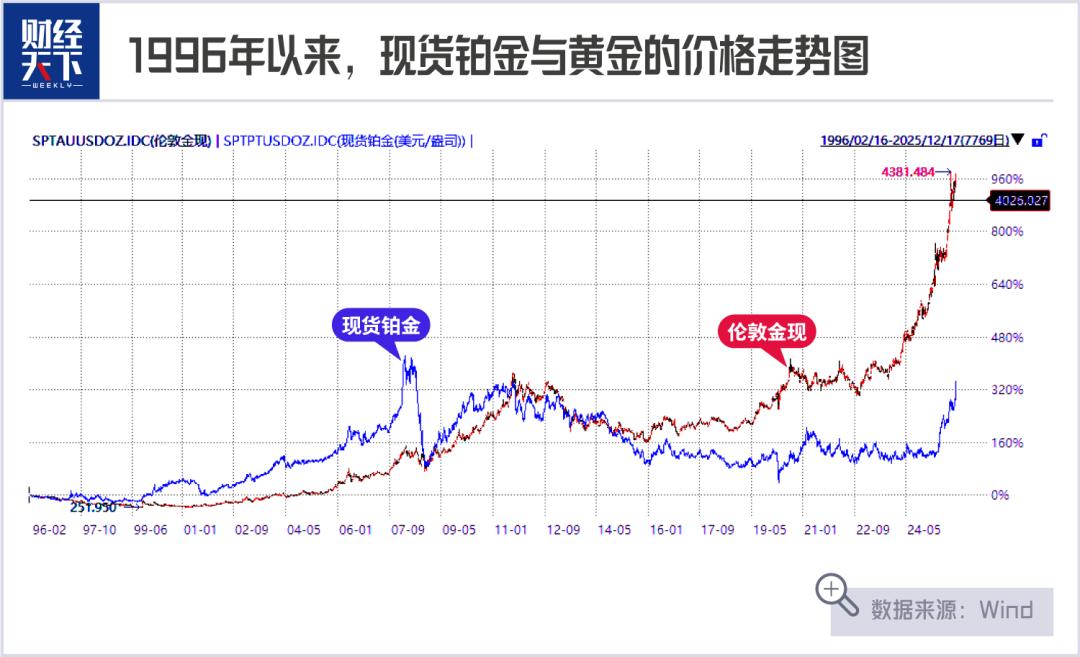 今年5月以来,"躺平"3年多的铂金价格终于迎来大涨,不到8个月时间便走出翻倍行情。即便如此,这个曾在婚戒市场上备受欢迎的"爱情金 属",仍未回到2008年的历史高点。铂金近28年的涨幅,比黄金低了约700个百分点。 01 "已经有人赚了好几波" "271元的时候买了50克,290元就抛了。"广东的95后杨洋回想起自己的铂金投资经历,仍然懊悔不已。 今年6月,国内现货铂金价格还不到300元/克。但让杨洋万万没想到的是,从那之后,国内现货铂金价格一路走高,半年内累计涨幅超过60%,明显跑赢 同期黄金表现。12月17日,国内现货铂金价格更是突破500元/克。 国际市场同样如此,国际现货铂金价格从2025年初的约900美元/盎司,上涨至12月18日的1980美元/盎司,尤其在12月,铂金价格已经连续6个交易日大 涨。铂金价格年内累计涨幅也一度达116%,突破持续多年的下降通道。 12月15日,广州期货交易所铂金期货主力合约盘中触及涨停板,日内涨幅达7%,这是该品种自今年11月27日上市以来首次涨停。 这种疯狂,不只体现在价格曲线上,还迅速传导到了消费端。 京东平台"618"销售数据显示,铂金相关产品成交额出现爆发式增 ...