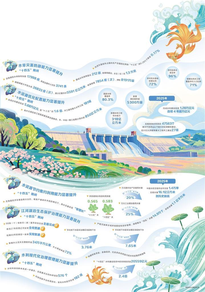 2025年水利建设投资与成果总结 - 2025年全年完成水利建设投资12848亿元,连续4年超万亿元[1][2] - 全年实施各类水利项目47563个,吸纳就业315万人[2] - 中国水权交易所全年交易1.4万单,交易水量16.1亿立方米,创历史新高[2] 2025年重大水利工程进展 - 太浦河后续一期、辽宁辽东半岛水资源配置工程可行性研究获批[2] - 淮河干流浮山以下段、峡涡段行洪区调整和建设,四川引大济岷等27项重大工程开工建设[2] - 黄河古贤水利枢纽工程导流洞顺利贯通[2] “十五五”时期水利发展战略与目标 - “十五五”时期是基本实现水利现代化夯实基础、全面发力的关键时期[3] - 2026年是“十五五”开局之年,目标是推动水利高质量发展、保障水安全,并为中国式现代化作出贡献[3] - 明确要实施6项战略任务,以在水利治理管理能力现代化、现代化水网建设、江河保护治理体系、数字孪生水利体系、水资源节约集约利用体系及体制机制法治管理方面取得决定性进展[3] 国家水网建设的战略意义与推进要求 - 国家水网建设是优化水资源配置、提高防洪减灾能力、保障国家水安全的战略举措,也是扩大内需的重要载体[3] - 国家水网主骨架和大动脉正逐步完善,骨干输排水通道、重要调蓄结点加快建设[3][4] - 加快构建国家水网可发挥水资源优化配置、流域防洪减灾、水生态系统保护等综合功能,并具有交通运输、生态环保、旅游景观等多重效应[4] - 推进要求包括加快项目前期工作与要素保障、创新投融资机制以引导各类资本投入、以及打造精品工程并加强全过程质量监管[4]