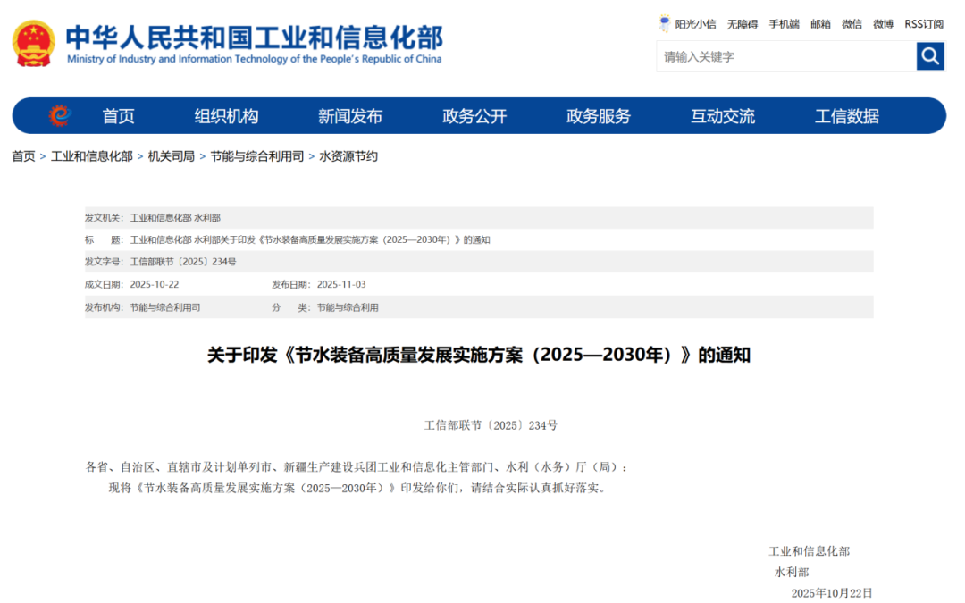 【导读】工业和信息化部、水利部印发《节水装备高质量发展实施方案(2025—2030年)》 事关节水装备,利好来了! 11月3日,工业和信息化部、水利部发布关于印发《节水装备高质量发展实施方案(2025—2030年)》(以下简称《实施方案》)的通知,意在加快以节 水装备高质量发展推动水资源节约集约利用,促进经济社会发展全面绿色转型。 《实施方案》提出,到2027年,重点领域供水、用水和循环利用等节水装备取得突破,掌握一批具有自主知识产权的核心技术,高效循环冷却、高端膜分 离、智慧用水管控等技术装备实现产业化应用。节水装备标准体系更加健全,培育一批节水装备龙头企业和制造业单项冠军、专精特新"小巨人"企业,推 动建立节水装备中试平台,形成大中小企业、产业链上中下游协同发展的良好生态。 到2030年,构建覆盖全面、技术先进的节水装备体系,高性能、高效率、高可靠性的节水装备供给能力持续增强,节水装备制造达到世界先进水平。 《实施方案》重点关注生产工艺流程中耗水量大的通用设备,围绕推动供水、用水、回用装备发展和数智化转型等4项重点任务: 一是围绕"供水",增强供水装备技术创新水平。聚焦净水、非常规水利用、特殊用途水处理装 ...