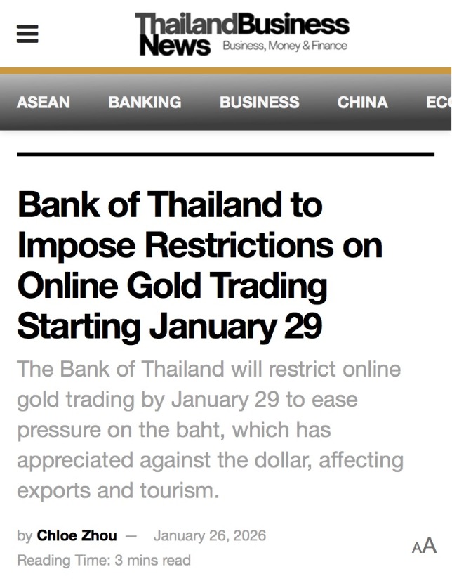 罕见!泰国央行:禁止黄金做空交易,线上黄金交易每日限额5000万泰铢