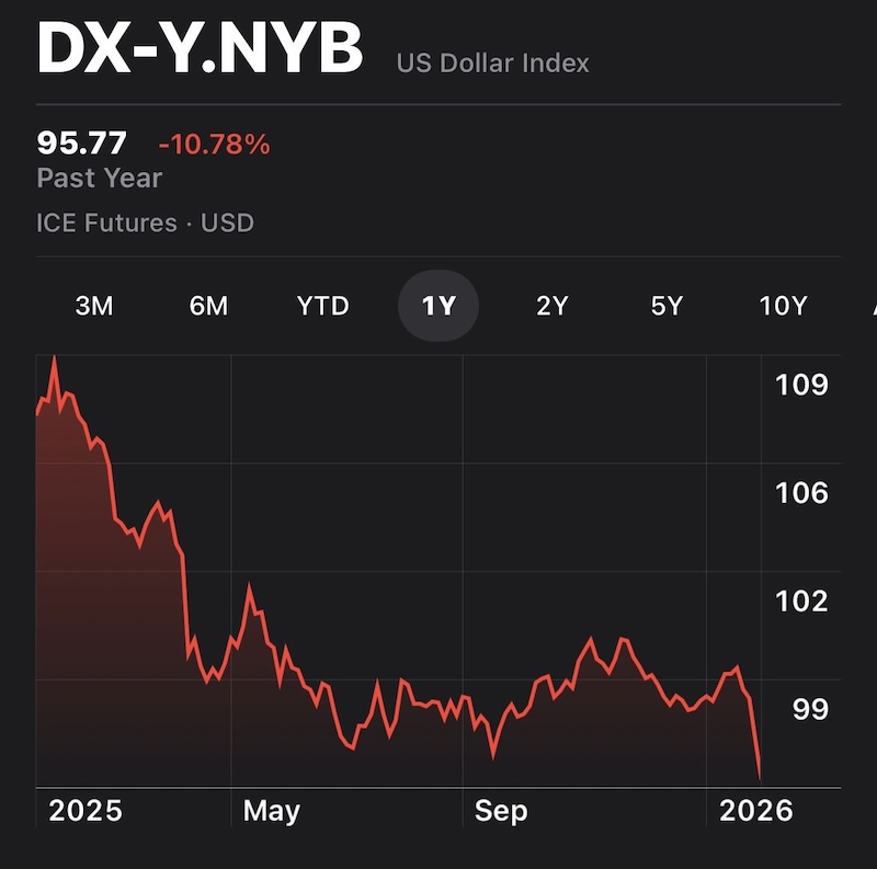 非美货币与黄金同步走强,日元成外汇市场焦点。 当地时间1月27日,美国总统特朗普在美国艾奥瓦州出席经济政策相关活动期间接受媒体采访时表示,并不担心美 元出现明显贬值,称美元"表现良好",并认为汇率回归"自身应有的水平"是合理现象。 当被问及是否担心美元走软时,特朗普回应称:"不,我认为美元表现很好。我希望回归自身应有的水平,这是合 理的做法。"他还暗示自己具备影响美元走势的能力,称"我可以让它像悠悠球一样涨跌"。 特朗普言论发布后,美元指数(DXY)短线一度小幅拉升,但随后快速转跌,盘中跌超50点,刷新2022年2月以 来新低。衡量美元对六种主要货币的美元指数当天下跌0.84%,在纽约尾盘报96.219。截至纽约汇市尾市,1欧元 兑换1.1979美元,高于前一交易日的1.1875美元;1英镑兑换1.3780美元,高于前一交易日的1.3679美元。 美元走弱带动非美货币集体反弹。离岸人民币兑美元一度逼近6.93关口。 避险资产继续受益,黄金延续强势走势,现货黄金刷新历史高位至每盎司5180美元上方。 "抛售美国"交易升温 本月以来,美元持续承压。市场普遍认为,特朗普的贸易政策不确定性,以及围绕美联储独立性的争议 ...