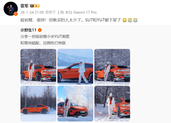 小米SU7、YU7下架熔岩橙配色,雷军无奈感慨道:敢买的人太少了