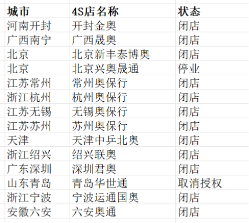 一位车主表示,她于今年1月中旬前往该4S店发现,店内已经空无一人,虽然展厅还陈列有车辆,但已 经被贴上封条。她表示,自己曾于2023年在门店购买了6年的保养套餐,如今4S跑路,不确定后续的保 养还能否兑现。 近日,多位奥迪车主反馈,开封金奥奥迪4S店疑似跑路,购买的保养套餐无法兑现。一汽奥迪客服表 示,开封金奥已于2025年11月13日从一汽奥迪退网,建议车主联系店内进行沟通,也可以考虑通过司法 途径寻求解决办法。 《次世代车研所》栏目根据各地车主们的反馈统计,自2025年底以来,除了开封金奥之外,还有十余家 奥迪4S店闭店,涉及广西、江苏、浙江、天津、广东、山东、安徽等多个省市。 数据显示,2025年奥迪在华销量同比下降5%,也是其连续两年在华销量下滑。压力之下,奥迪多款车 型开启大幅降价促销,有经销商对于奥迪A3(2026款)的报价已经降至10.67万元起,相当于打六折。 近期多家4S店"消失了" 近日,多位一汽奥迪车主向《次世代车研所》栏目反馈,开封金奥奥迪4S店疑似跑路,购买的保养套 餐无法使用,甚至连门店员工都在讨要工资。 多位车主面临着类似的尴尬境地。车主们花费了1.68万元、1.88万元购买了多 ...
