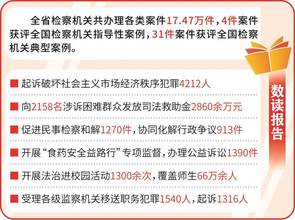核心观点 - 四川省检察机关2025年工作报告显示,其工作重点围绕服务区域发展战略、优化法治化营商环境、维护社会稳定与安全、深化民生司法保障以及强化法律监督职能展开,2026年工作安排将进一步聚焦于现代化产业体系、新质生产力、特定群体权益保障及检察队伍自身建设 [1][2][3][4][5][6][7] 2025年主要工作成果 服务区域发展战略与营商环境 - 推动党建与业务深度融合,以习近平法治思想指导工作 [1] - 深化服务成渝地区双城经济圈建设和五区共兴发展,川渝检察机关协作办案132件 [1] - 着力优化法治化营商环境,起诉破坏社会主义市场经济秩序犯罪4212人 [1] - 加强知识产权司法保护,起诉侵犯知识产权犯罪683人 [1] 生态环境保护 - 持续筑牢长江黄河上游生态屏障,起诉破坏生态环境资源犯罪1616人,办理公益诉讼2326件 [1] 城乡融合与乡村振兴 - 多元助力城乡融合发展和乡村全面振兴,向2158名涉诉困难群众发放司法救助金2860余万元 [2] - 协同推动文旅深度融合发展,加强三星堆、峨眉山等文旅地标保护 [2] 维护国家安全与社会稳定 - 坚决维护国家安全和社会稳定,依法从严惩治严重暴力犯罪,常态化开展扫黑除恶斗争 [2] - 开展检察公益诉讼护航安全生产专项监督,办理公益诉讼958件 [2] 维护经济与网络安全 - 全力维护经济安全,起诉金融诈骗、破坏金融管理秩序犯罪644人,加大虚拟货币等新兴领域犯罪打击力度,保持惩治非法集资犯罪高压态势 [2] - 着力维护网络空间安全,起诉利用网络实施的犯罪7223人 [2] 犯罪治理与风险化解 - 宽严相济推进源头治理,起诉危险驾驶犯罪9533人(起诉人数连续两年下降),制发社会治理检察建议719份 [2] - 综合施策防范化解风险,促进民事检察和解1270件,协同化解行政争议913件,实现县级检察院入驻综治中心全覆盖 [3] 民生领域监督 - 深入推进民生领域专项监督,开展“食药安全益路行”专项监督办理公益诉讼1390件,联合开展医保基金整治起诉医保骗保犯罪116人 [3] 特定群体权益保护与法治宣传 - 依法保护特定群体合法权益,支持农民工起诉追讨欠薪6500余万元,办理妇女权益保障公益诉讼76件 [4] - 结合办案深化法治宣传教育,发布典型案例23批152件,开展法治进校园活动1300余次覆盖师生66万余人 [4] 法律监督职能履行 - 精准有效做强民事检察,对民事生效裁判提出抗诉和再审检察建议449件,对民事审判和执行活动提出检察建议3188件 [4] - 持续有力做好公益诉讼检察,提起诉讼613件,99.31%得到裁判支持 [5] - 深化职务犯罪检察和检察侦查,受理各级监察机关移送职务犯罪1540人,起诉1316人 [6] 2026年工作安排重点 服务经济发展与科技创新 - 聚焦建设现代化产业体系,强化产权执法司法保护,助力营造法治化营商环境 [7] - 因地制宜发展新质生产力,维护科技创新主体合法权益 [7] - 深化文物文化遗产、文旅地标司法保护,助力打造“锦绣天府·安逸四川”文旅品牌 [7] 保障特定群体权益 - 持续开展依法惩治未成年人违法犯罪专项行动 [7] - 强化妇女、老年人、残疾人等群体权益保障,依法保护农民工、灵活就业和新就业形态劳动者权益 [7] 强化法律监督与队伍建设 - 加强“四大检察”基本职能建设,加强对立案、侦查、审判、执行等活动的法律监督,推动监督能力更强、质量更优、效果更好 [7] - 坚持以党的政治建设为统领,提升检察队伍政治素质、专业素能和职业道德素养,纵深推进全面从严管党治检 [7]