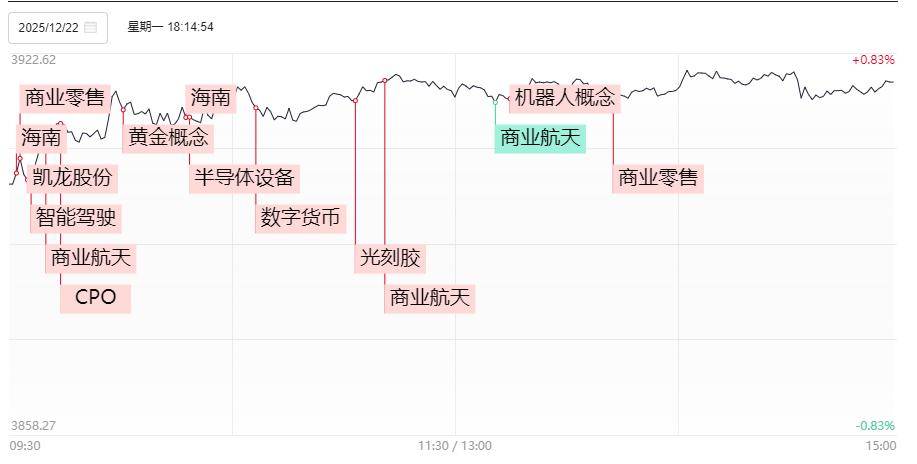 12月22日,A股量价齐升,创业板指在科技股带动下涨逾2%,成交额仍低于1.9万亿元,近3000只个股收红。CPO(共 封装光学)龙头股"易中天"(新易盛(300502)、中际旭创(300308)、天孚通信(300394))集体大涨,海南自贸 概念爆发。 受访人士表示,今日大涨显示市场底气仍在。预计短期内沪指在3800至3900点区间震荡。配置上建议均衡布局、严控 回撤,重点关注现金流稳定、基本面扎实的标的。 海南自贸概念掀涨停潮 沪指收涨0.69%报3917.36点,创业板指收涨2.23%报3191.98点,深证成指收涨1.47%。沪深300、上证50、北证50微 涨,科创50涨幅超过2%。 今日,市场交投回暖,成交额较上一交易日放大1335亿元,达1.88万亿元。截至12月19日,沪深京两融余额增至2.5万 亿元。 盘面上,科技、零售、贵金属齐飞,CPO概念、海南自贸、F5G概念大涨,半导体、电子元件、零售涨势也不错。 板块涨多跌少,31个申万一级行业中22个收红,通信领涨,综合、电子、有色金属、商贸零售、石油石化、基础化 工、机械设备、电力设备涨幅均超过1%。但传媒、银行、美容护理、轻工制造、纺织服饰、 ...