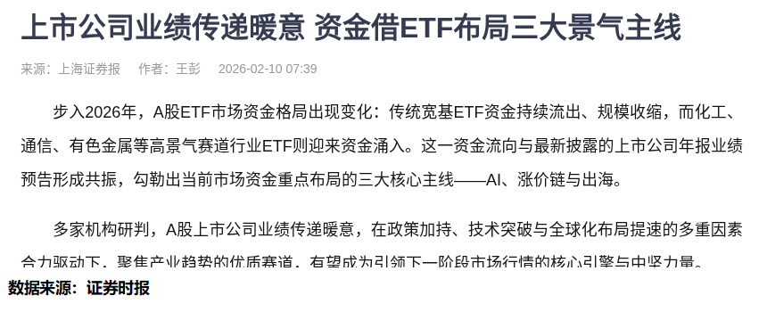 文章核心观点 - 2026年初A股ETF市场资金流向发生显著变化,资金从传统宽基ETF流出,并大幅涌入化工、通信、有色金属等高景气赛道行业ETF,市场资金布局的三大核心主线是AI、涨价链与出海 [2] - 这一资金流向与上市公司2025年业绩预告显示的盈利修复趋势及结构性景气方向形成共振,在政策、技术与全球化等多重因素驱动下,聚焦产业趋势的优质赛道有望成为引领下一阶段市场行情的核心力量 [2][4] ETF市场资金流向分化 - 2026年以来,ETF市场资金流向呈现分化格局,部分沪深300、中证1000相关宽基ETF规模显著下降,而化工、通信、软件、有色金属等行业ETF则迎来资金大幅净流入 [3] - 截至2月6日,今年以来共有7只行业ETF资金净流入超100亿元,涉及通信、化工、有色金属、黄金、卫星和半导体设备等板块 [3] - 具体数据:国泰通信ETF获239.54亿元资金净流入,份额增长近100亿份;鹏华化工ETF获155.34亿元资金净流入,份额从去年底的206亿份增长至380.7亿份,增幅达85%;南方有色金属ETF获127.58亿元资金净流入,份额从去年底的106.88亿份增至163.74亿份,增幅为53.2% [3] A股盈利修复的结构性特征 - 截至2026年1月31日,A股2025年业绩预告基本披露完毕,全部A股以中位数、整体法计算的净利润累计同比增速分别为17.94%、37.26%,均上升至2022年以来新高,确认了盈利修复趋势 [4] - 从结构看,盈利修复呈现三大景气方向:以电子、通信、计算机、机械等行业为代表的AI需求领域;以有色金属、化工为代表的涨价板块;涵盖医药、电池、风电、游戏等行业的出海主线 [4] - 在多路资金推动下,相关板块表现亮眼,截至2月9日,申万传媒、有色金属、石油石化、基础化工行业指数今年以来涨幅均超过10%,在申万31个行业指数中排名领先 [5] 三大核心主线的内在逻辑 - **资源品(涨价链)迎来大周期**:AI、高端制造等新产业带来增量需求,而地缘等因素限制供给,导致供需缺口,叠加去美元化等宏观叙事,大宗商品持续涨价,行业景气度高 [6] - **AI板块业绩迎来爆发**:云厂商加大数据中心资本开支,直接拉动算力芯片、光模块、存储芯片等产业链需求高增长,硬件端景气度提升,同时AI应用渗透率快速提升,相关行业业绩迎来拐点 [6] - **龙头制造业出海开辟新成长曲线**:2025年新兴市场工业化进程提速,基建与制造业升级需求旺盛,具备技术、成本、规模优势的中国制造龙头充分受益,汽车及零部件、电力设备、船舶等领域企业通过海外建厂、出口扩张等方式,海外收入占比持续提升,成为行业增长核心驱动力 [6] 上市公司盈利改善趋势与驱动因素 - 全部A股上市公司(剔除金融股)的自由现金流分析表明,上市公司基本面正呈现改善趋势,2026年有望迎来盈利增长拐点 [7] - 驱动因素包括:AI技术应用扩展有望推动高技术制造业业绩加速增长;“反内卷”政策稳步落地有助于产能周期结束筑底,走向整体复苏 [7] - 中国企业盈利能力呈现结构性改善迹象,AI、创新药、体验消费等创新领域持续活跃,为盈利增长注入新动能,同时全球化进程加速,出口商品附加值提升推动海外营收占比不断增长,为企业盈利开拓了更多元、可持续的来源 [7] 后市投资机遇展望 - 展望后市,科技创新、产业升级、绿色转型等主线依然清晰,在盈利逐步改善、政策持续支持以及全球竞争力不断提升的背景下,相关领域蕴藏丰富投资机遇 [8] - 中国半导体自主可控进程显著加快,自给率从2020年的16%提升至2025年的约26%,预计这一增长趋势将在2026年延续,驱动因素包括本土客户需求增加、技术能力提升等 [8] - 中国半导体设备企业已具备显著战略优势,核心驱动因素包括市场份额提升,以及人工智能GPU、高带宽内存HBM、检测设备的产能需求拉动,存储行业周期复苏力度超预期 [8] - 在政策红利与工程师红利共同推动下,高端制造业的研发能力与系统集成水平预计将显著提升,随着产业升级与出海进程持续获得市场认可,具备高科技含量和高附加值的成套装备产业有望延续增长态势 [9] - 军工(含商业航天)、核电、风电、储能等高端制造细分领域或将涌现一批具有全球竞争力的龙头企业 [10]
