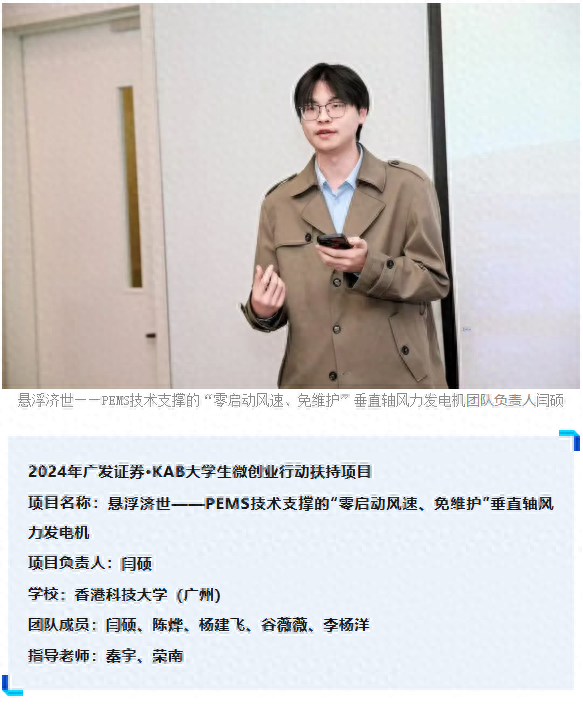 项目简介 风力发电作为一种清洁、可再生的能源形式,正在全球范围内得到广泛应 用。然而,风力发电机受摩擦力的影响存在最小启动风速较大、能量转换 效率较低的问题,目前常见的解决方案是优化控制系统和叶片结构,其虽 然小幅度降低了最小启动风速,但未解决摩擦问题,为了降低最小启动风 速,本项目研究和开发一种基于永磁电磁混合悬浮技术的风力发电机,进 一步降低发电设备的最小启动风速和提高能量转换效率。 工作场景图片 悬浮济世一一PEMS技术支撑的"零启动风速、免维护"垂直轴风力发电机团队负责人闫硕 2024年广发证券·KAB大学生微创业行动扶持项目 项目名称:悬浮涂世 -- PEMS技术支撑的"零启动风速、免维护"垂直轴风 力发电机 项目负责人: 自硕 学校:香港科技大学(广州) 团队成员: 闫硕、陈烨、杨建飞、谷薇薇、李杨洋 指导老师: 奉宇、荣南 感悟微创业 随着创业的进行,我想说"商业化它真的不是最终目的",我们做的风力发 电机能够提高能源效率,为大家带去源源不断的能量。我也计划把未来5% 的收益都捐给风电领域的公益组织,支持他们的行动。 产品介绍海报 商业模式 本产品定位在中下游,所开发的是第二代磁悬浮市场,目前国 ...
