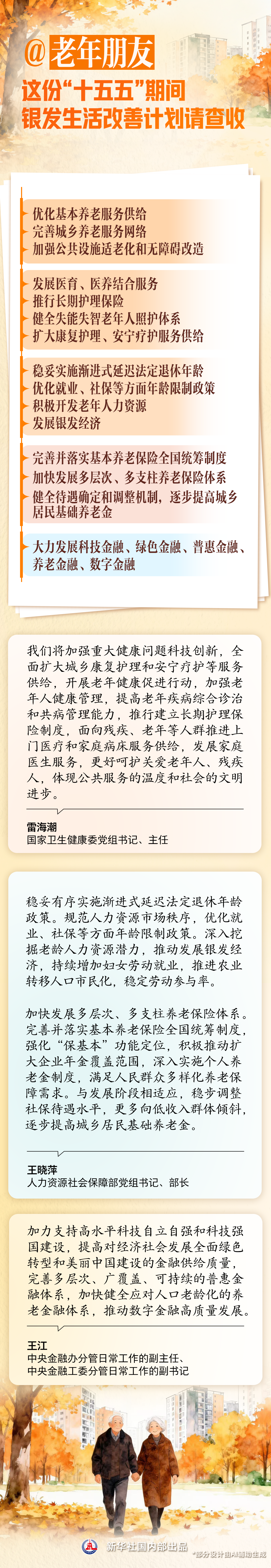 a 老年朋友 区分"十五五"期间 银发生活改善计划请查收 优化基本养老服务供给 完善城乡养老服务网络 加强公共设施适老化和无障碍改造 大力发展科技金融、绿色金融、普惠金融、 养老金融、数字金融 我们将加强重大健康问题科技创新,全 面扩大城乡康复护理和安宁疗护等服务 供给,开展老年健康促进行动,加强老 年人健康管理,提高老年疾病综合诊治 和共病管理能力,推行建立长期护理保 险制度,面向残疾、老年等人群推进上 门医疗和家庭病床服务供给,发展家庭 医生服务,更好呵护关爱老年人、残疾 人,体现公共服务的温度和社会的文明 进步。 雷海潮 国家卫生健康委党组书记、主任 稳妥有序实施渐进式延迟法定退休年龄 政策。规范人力资源市场秩序,优化就 业、社保等方面年龄限制政策。深入挖 掘老龄人力资源潜力,推动发展银发经 济,持续增加妇女劳动就业,推进农业 转移人口市民化,稳定劳动参与率。 发展医育、医养结合服务 推行长期护理保险 健全失能失智老年人照护体系 扩大康复护理、安宁疗护服务供给 稳妥实施渐进式延迟法定退休年龄 优化就业、社保等方面年龄限制政策 积极开发老年人力资源 发展银发经济 完善并落实基本养老保险全国统筹制度 加快发 ...