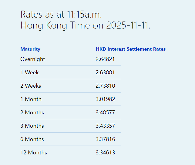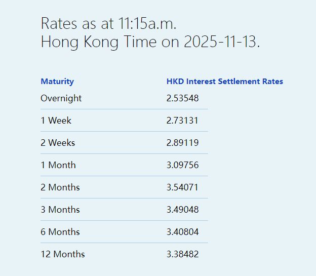 | Maturity | HKD Interest Settlement Rates | | --- | --- | | Overnight | 2.53548 | | 1 Week | 2.73131 | | 2 Weeks | 2.89119 | | 1 Month | 3.09756 | | 2 Months | 3.54071 | | 3 Months | 3.49048 | | 6 Months | 3.40804 | | 12 Months | 3.38482 | 智通财经APP获悉,11月13日,港元拆息普遍向上,隔夜拆息报2.53548%,跌15.19基点;一周拆息升 3.131基点,报2.73131%,两周拆息升12.911基点,报2.89119%。与楼按相关的一个月拆息报 3.09756%,跌1.905基点;反映银行资金成本的三个月拆息报3.49048%,升3.274基点。 长息方面,六个月拆息升1.709基点,报3.40804%,一年拆息则升2.089基点,报3.38482%。 ...