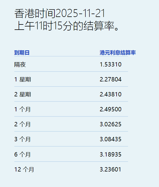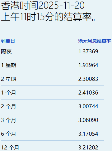 | 香港时间2025-11-20 | | --- | | 上午11时15分的结算率。 | | 到期日 | 港元利息结算率 | | --- | --- | | 陽夜 | 1.37369 | | 1 星期 | 1.93964 | | 2 星期 | 2.30083 | | 1 个月 | 2.41036 | | 2个月 | 3.00744 | | 3个月 | 3.08090 | | 6个月 | 3.17054 | | 12 个月 | 3.21202 | 智通财经APP获悉,11月20日,港元拆息全线上升,而与楼按相关的一个月拆息终止五连跌,报 2.41036%,升12.667基点;反映银行资金成本的三个月拆息报3.0809%,升2.316基点。 隔夜息报1.37369%,升31.119基点;一周拆息升55.601基点,报1.93964%,两周则升15.702基点,报 2.30083%。长息方面,六个月拆息升1.352基点,报3.17054%,一年期则升1.922基点,报3.21202%。 ...
