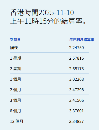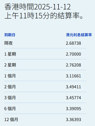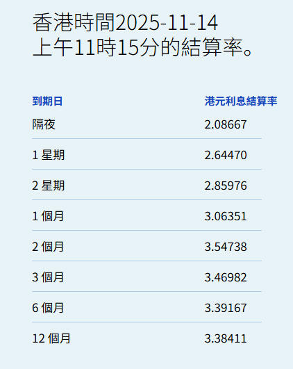 智通财经APP获悉,11月14日,港元拆息全线向下,隔夜息报2.08667%,跌44.881基点;一周拆息跌 8.661基点,报2.6447%,两周则跌3.143基点,报2.85976%。与楼按相关的一个月拆息连跌两日,报 3.06351%,跌3.405基点。 | 香港時間2025-11-14 | | --- | | 上午11時15分的結算率。 | | 到期日 | 港元利息結算率 | | --- | --- | | 隔夜 | 2.08667 | | 1 星期 | 2.64470 | | 2 星期 | 2.85976 | | 1 個月 | 3.06351 | | 2 個月 | 3.54738 | | 3 個月 | 3.46982 | | 6 個月 | 3.39167 | | 12 個月 | 3.38411 | 反映银行资金成本的三个月拆息报3.46982%,跌2.066基点。长息方面,六个月拆息跌1.637基点,报 3.39167%,一年期则跌0.071基点,报3.38411%。 ...