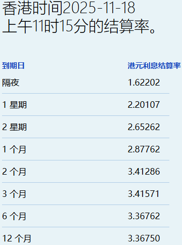 | 合港的旧2025-11-18 | | | --- | --- | | | 上午11时15分的结算率。 | | 到期日 | 港元利息结算率 | | 喝夜 | 1.62202 | | 1 星期 | 2.20107 | | 2 星期 | 2.65262 | | 1 个月 | 2.87762 | | 2个月 | 3.41286 | | 3 个月 | 3.41571 | | 6个月 | 3.36762 | | 12 个月 | 3.36750 | 智通财经APP获悉,11月18日,港元拆息全线下跌,而与楼按相关的一个月拆息连跌四日,报 2.87762%,跌12.667基点,兼见两个月新低;反映银行资金成本的三个月拆息报3.41571%,跌1.905基 点。 隔夜息报1.62202%,跌18.977基点;一周拆息跌17.339基点,报2.20107%,两周则跌8.53基点,报 2.65262%。长息方面,六个月拆息跌4.488基点,报3.36762%,一年期则跌2.56基点,报3.3675%。 ...