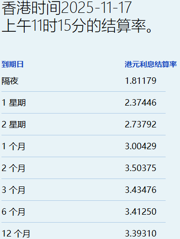 智通财经APP获悉,11月17日,港元拆息普遍下跌,而与楼按相关的一个月拆息报3.00429%,跌5.922 基点;反映银行资金成本的三个月拆息报3.43476%,跌3.506基点。 | 到期日 | 港元利息结算率 | | --- | --- | | 陽夜 | 1.81179 | | 1 星期 | 2.37446 | | 2 星期 | 2.73792 | | 1 个月 | 3.00429 | | 2个月 | 3.50375 | | 3个月 | 3.43476 | | 6个月 | 3.41250 | | 12 个月 | 3.39310 | | 香港时间2025-11-17 | | --- | | 上午11时15分的结算率。 | 隔夜息报1.81179%,跌27.488基点;一周拆息跌27.024基点,报2.37446%,两周则跌12.184基点,报 2.73792%。长息方面,六个月拆息升2.083基点,报3.4125%,一年期则升0.899基点,报3.3931%。 ...