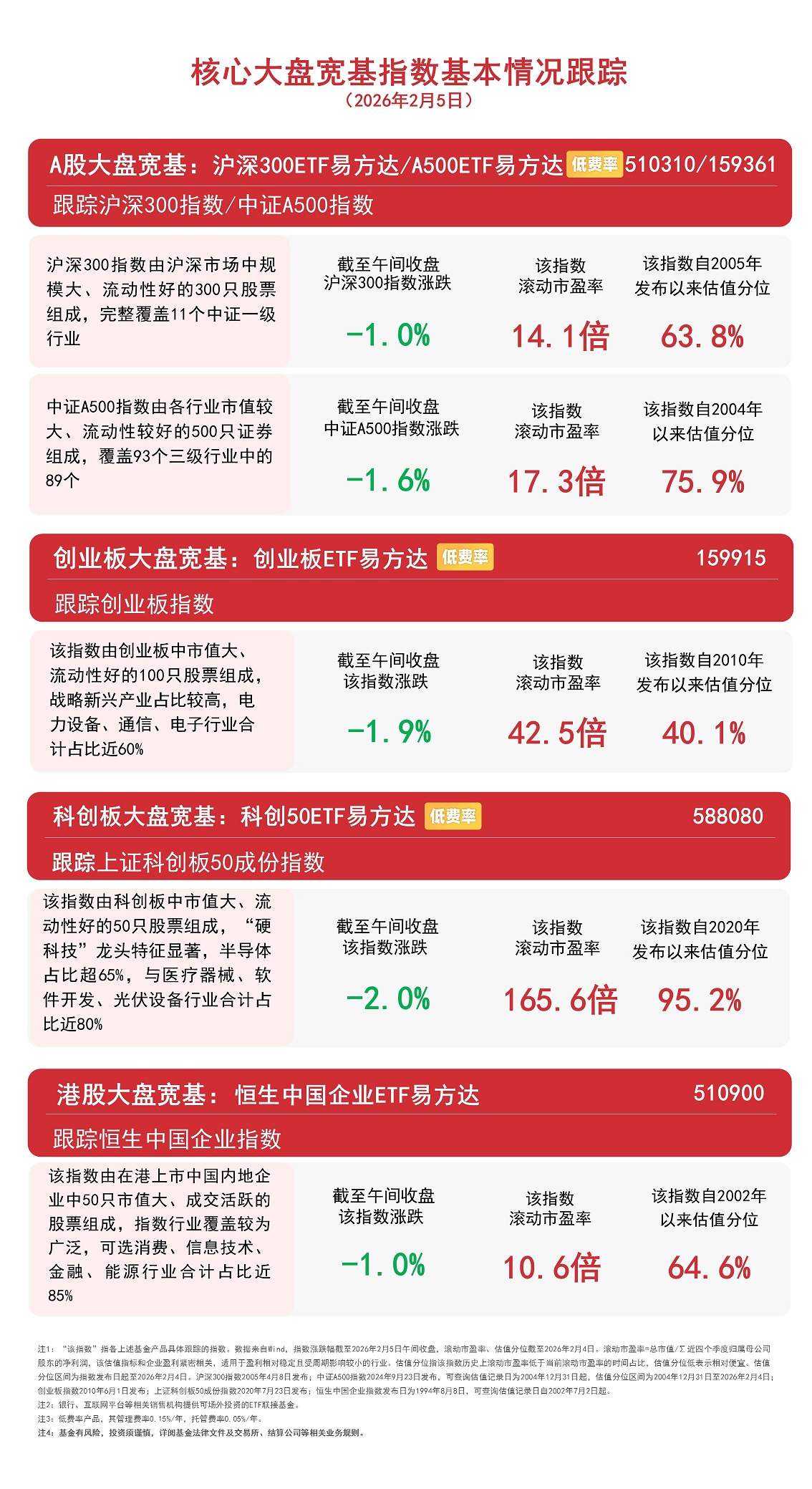 市场整体表现 - 2月5日早盘A股三大指数均跌逾1% 市场整体走弱[1] - 截至午间收盘 中证A500指数下跌1.6% 沪深300指数下跌1.0% 创业板指数下跌1.9% 上证科创板50成份指数下跌2.0%[1] - 港股整体走弱 恒生中国企业指数下跌1.0%[1] 行业板块表现 - A股涨幅居前板块包括影视院线 美容护理 旅游及酒店 零售 食品加工制造 银行 短剧游戏 房地产[1] - A股跌幅居前板块包括有色金属 光伏设备 电网设备 培育钻石 CPO 光纤 半导体[1] - 港股消费股逆势走强 科技股延续回调[1] 主要宽基指数估值数据 - 沪深300指数滚动市盈率为14.1倍 自2005年发布以来估值分位为63.8%[3] - 中证A500指数滚动市盈率为17.3倍 自2004年以来估值分位为75.9%[3] - 创业板指数滚动市盈率为42.5倍 自2010年发布以来估值分位为40.1%[3] - 上证科创板50成份指数滚动市盈率数据未在提供内容中完整显示[3] 指数构成与特征 - 沪深300指数由沪深市场中规模大 流动性好的300只股票组成 完整覆盖11个中证一级行业[3] - 中证A500指数由各行业市值较大 流动性较好的500只证券组成 覆盖93个三级行业中的89个[3] - 创业板指数由创业板中市值大 流动性好的100只股票组成 战略新兴产业占比较高 电力设备 通信 电子行业合计占比近60%[3] - 上证科创板50成份指数由科创板中市值大 流动性好的50只股票组成 “硬科技”龙头特征显著 半导体占比超65%[3]