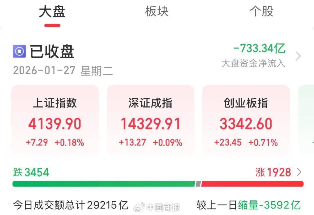 市场整体表现 - 1月27日A股三大股指集体低开,盘中震荡后冲高回落,最终上证综指涨0.18%报4139.9点,科创50指数涨1.51%报1555.98点,深证成指涨0.09%报14329.91点,创业板指涨0.71%报3342.6点 [2] - 两市及北交所共1928家上涨,3450家下跌,91家平盘 [3] - 两市成交总额为28949亿元,较前一交易日减少3533亿元,其中沪市成交12894亿元,深市成交16055亿元 [3] - 两市及北交所共有94只股票涨幅在9%以上,9只股票跌幅在9%以上 [4] 领涨行业与板块 - 半导体板块大幅上涨,拉普拉斯、东芯股份、盛科通信等超20股涨停或涨超10% [5] - 黄金股再度上涨,晓程科技、四川黄金、湖南黄金、招金黄金等涨停或涨超10% [5] - 航天军工板块涨幅靠前,三角防务、航发科技、航发动力等涨停或涨超10% [5] - 银行股出现反弹,青岛银行涨超2%,农业银行、宁波银行等涨幅靠前 [5] - AI算力产业链走强,存储器、CPO方向领涨,商业航天、太空光伏概念股午后拉升 [2] 领跌行业与板块 - 煤炭股领跌,大有能源、云煤能源、兰花科创等跌超4%,安泰集团、山西焦化等跌超2% [6] - 农林牧渔板块跌幅靠前,回盛生物、福建金森等跌超7%,晓鸣股份、新农开发等跌超5% [6] - 钢铁股表现不佳,八一钢铁、钒钛股份、金岭矿业等跌超5%,大中矿业、宝地矿业等跌超3% [6] - 基本金属、零售板块跌幅靠前,疫苗、锂电池题材走弱 [2] 机构观点与后市展望 - 财信证券认为短期内A股或延续震荡,普涨行情可能仍需等待,但成交额维持较高水平下仍有较多结构性机会,中期维持从2025年12月中旬到2026年3月初为做多窗口期的判断 [7] - 东莞证券认为地缘政治不确定性等因素促使避险资金涌入黄金白银市场,A股市场仅为短线调整风险,短期调整有利于夯实基础,后市将继续向上拓展空间 [7] - 华龙证券认为临近春节市场或高位震荡,需关注回抽20日均线的可能性,以中证2000为代表的中小盘股调整明显,显示资金偏好转向业绩确定性,年报披露期大资金交易趋向谨慎 [7] - 华西证券中长期视角下认为本轮行情仍处中段,“慢牛”趋势有望延续,对比历史高点,沪深300指数当前点位仅至中段,当前沪深300风险溢价为5.27%,历史行情中风险溢价曾降低至2.5%,A股总市值/M2等指标处于历史中枢附近,表明行情仍有充足空间 [8][9] - 华西证券建议关注科技产业行情扩散(如AI算力、AI应用、机器人、太空光伏、存储、港股互联网)、受益于“反内卷”与涨价方向(如化工、有色金属)以及年报业绩预告高增行业(如电子、机械设备、医药) [8][9] - 中泰证券认为当前市场情绪偏热,投机惯性较强,“汇金系”ETF出现大额资金流出,金融监管部门或延续“降温”导向,建议投资者适度降低对交易拥挤、估值透支的主题类资产的仓位,短期建议关注电力设备(光伏)和机器人板块 [10]