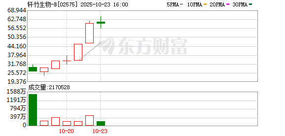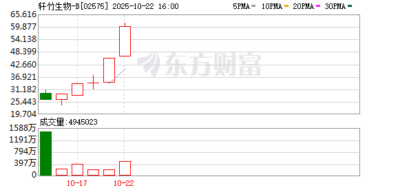 登陆港股市场的第7个交易日,轩竹生物-B(HK02575,股价59.500港元,市值308.180亿港元)的市值 已经超过300亿港元。 10月22日,这家来自河北的Biotech(生物科技公司)开盘大涨,股价一度站上61.500港元/股的高位, 较上市首日的开盘价翻了一倍。截至10月22日收盘,公司股价涨幅超31%,报收60.000港元/股,较发行 价上涨约417%,单日成交额2.78亿港元。10月23日,截至收盘,轩竹生物-B股价下跌0.83%。 消息面上,轩竹生物于10月22日早间发布公告称,公司已在2025年欧洲肿瘤内科学会(ESMO)上,以 壁报的形式展示了吡洛西利联合来曲唑或阿那曲唑在HR+/HER2-(激素受体阳性、人表皮生长因子受 体2阴性)晚期乳腺癌一线治疗的临床Ⅲ期(BRIGHT-3)的期中分析结果。 港股创新药正在经历调整期,轩竹生物为何此时能逆势大涨?10月22日,《每日经济新闻》记者拨打了 公司公开电话,截至发稿未获接听。 2025年10月15日,轩竹生物正式登陆港交所,上市首日,轩竹生物高开153.97%,开盘价报29.460港元/ 股。每经记者李旭馗摄 公司股价为何大涨? 资料显 ...