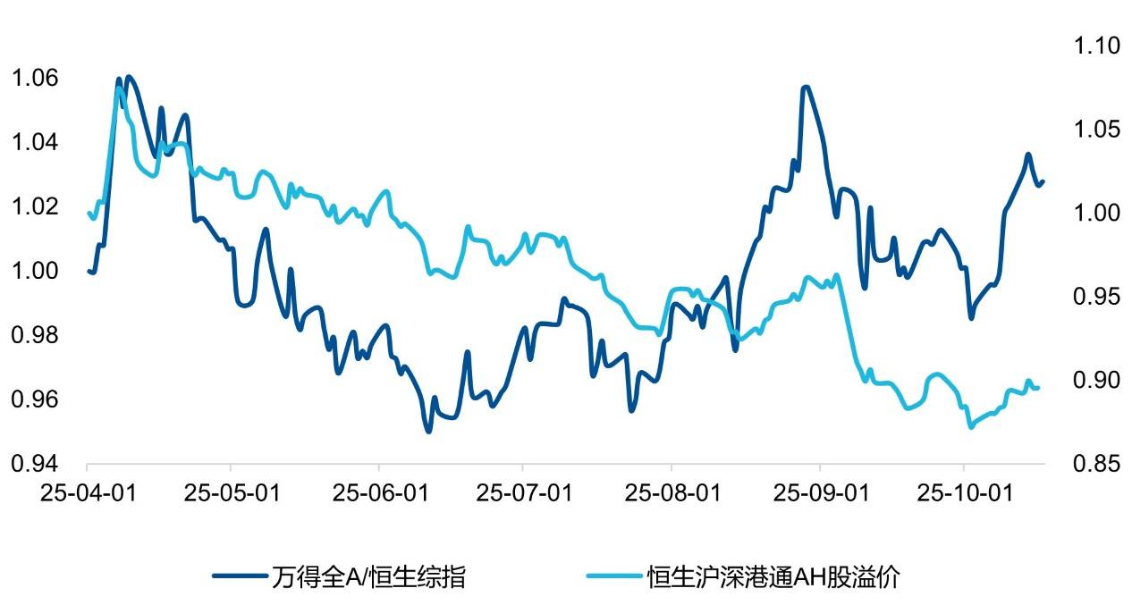 近期,A股与H股的估值差异重新拉大,AH溢价指数自10月以来持续上行,港股的相对估值优势逐步显现,H股的性价比正在重新回归投资者视野。本文将 从三个角度解读港股投资性价比提升的逻辑: 1、AH溢价的定义与边际变化 图:AH两地上市龙头股AH溢价周度变动情况 数据来源:Wind,截至2025/10/15 许多中国龙头企业选择了两地上市——即同一家公司同时在内地(A股)与香港(H股)挂牌交易。由于投资者结构、资金属性、流动性状况与汇率预期存 在差异,两地市场对同一公司的定价并不完全一致,这种价差即被称为"AH溢价"。通常而言,AH溢价指数越高,意味着A股估值相对更高,而H股则展现 出更具吸引力的价格优势。 从整体溢价水平来看,市场主要通过两类指标来追踪这一差异:(1)万得全A与恒生综合指数的比值;(2)恒生沪深港通AH股溢价指数。最新数据显 示,10月以来,AH溢价指数持续上升,表明A股相对于H股的估值差距进一步扩大。背后的原因在于:一方面,内地市场风险偏好回升,资金更倾向追逐成 长性资产;另一方面,人民币汇率自三季度以来持续升值,带动外资对中国资产的再配置意愿增强,使H股市场的外资流入预期显著改善。 图:AH股 ...