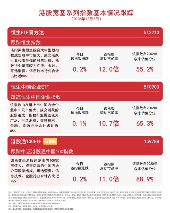 市场表现与指数概况 - 恒生指数收盘上涨0.2% [1] - 恒生中国企业指数收盘上涨0.1% [1] - 中证港股通中国100指数收盘上涨0.2% [1] 市场观点与投资机会 - 当前市场已接近利空出尽状态,前期风险点如海外流动性宽松交易回摆及外卖大战对互联网板块盈利的冲击已在回调过程中释放相对充分 [1] - 当前市场点位下行空间相对有限 [1] - 情绪指标在悲观区间反复震荡表明市场依然缺乏主线催化,总体指向左侧布局机会 [1] 主要港股指数ETF详情 - 恒生ETF易方达(513210)跟踪恒生指数,该指数由恒生综合大中型股指数成份股中市值大、成交活跃、行业代表性强的股票组成 [2] - 恒生指数行业覆盖广泛,金融、可选消费、信息技术行业合计占比近80% [2] - 恒生指数今日上涨0.2%,滚动市盈率为12.0倍,自2002年以来估值分位为55.2% [2] - 恒生中国企业ETF(510900)跟踪恒生中国企业指数,该指数由在港上市中国内地企业中50只市值大、成交活跃的股票组成 [2] - 恒生中国企业指数行业覆盖广泛,可选消费、信息技术、金融、能源行业合计占比近85% [2] - 恒生中国企业指数今日上涨0.1%,滚动市盈率为10.7倍,自2002年以来估值分位为65.3% [2] - 港股通100ETF(159788)跟踪中证港股通中国100指数,该指数由港股通范围内100家市值大、成交活跃的中国内地公司股票组成 [2] - 中证港股通中国100指数行业覆盖中,可选消费、信息技术、金融行业合计占比近75% [2] - 中证港股通中国100指数今日上涨0.2%,滚动市盈率为11.0倍,自2020年以来估值分位为88.9% [2]