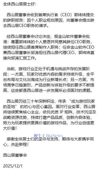公司管理层变动 - 首席执行官郭炜炜因个人职业规划原因辞去西山居CEO职务 [1][4] - 郭炜炜将继续担任西山居首席制作人职务并向代理CEO邹涛汇报工作 [2][4] - 金山软件CEO兼西山居董事长邹涛被任命为西山居代理CEO [2][4] 行业环境分析 - 游戏行业处于机遇与挑战并存阶段 玩家对优质内容需求持续升级 [4] - 全平台布局与文化出海成为行业新增长点 [4] - 市场竞争日趋激烈 产品创新与体验升级要求不断提高 [4] 公司战略方向 - 公司将继续聚焦核心主业 依托优质IP矩阵和技术沉淀 [5] - 公司致力于持续打磨产品品质和创新内容体验 [5] - 公司目标是为玩家提供更具价值的游戏作品并为行业创造更大价值 [5]
