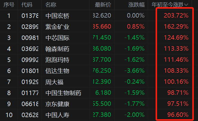 25年恒指累涨近28%:中国宏桥暴涨203.72%居成份股榜首,近10只个股翻倍