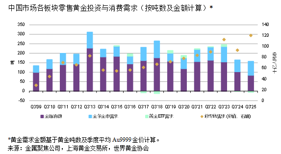 【环球网消费综合报道】世界黄金协会最新发布的《全球黄金需求趋势报告》显示,2025年三季度全球 黄金需求总量(包含场外交易)达到1313吨,需求总金额高达1460亿美元,双双创下单季度黄金需求的 高纪录。在全球市场动荡的背景下,黄金作为避险资产的吸引力被空前放大。 投资需求飙升,ETF与实物黄金双轮驱动 据了解,本轮黄金需求的增长主要由投资需求强势推动。三季度,全球黄金投资需求激增至537吨,同 比大幅增长47%,占全部黄金净需求的55%。 这一增长背后是多重因素的叠加效应,地缘政治不确定性、美元走弱态势,以及金价不断攀升引发的投 资者"错失恐惧"(FOMO)心理,共同促使资金大举涌入黄金市场。 其中,黄金ETF连续第三个季度获得大额增持,全球持仓再增222吨,流入金额达260亿美元。2025年前 三个季度,全球黄金ETF总持仓已累计增加619吨(约合640亿美元),北美地区基金领跑,欧洲与亚洲 地区基金紧随其后。 与此同时,实物黄金投资同样火热。三季度全球金条与金币需求同比增长17%,总量达316吨。印度和 中国作为两大传统市场,分别贡献了92吨和74吨的强劲需求。 金饰消费承压,央行购金步伐不减 与投资需 ...