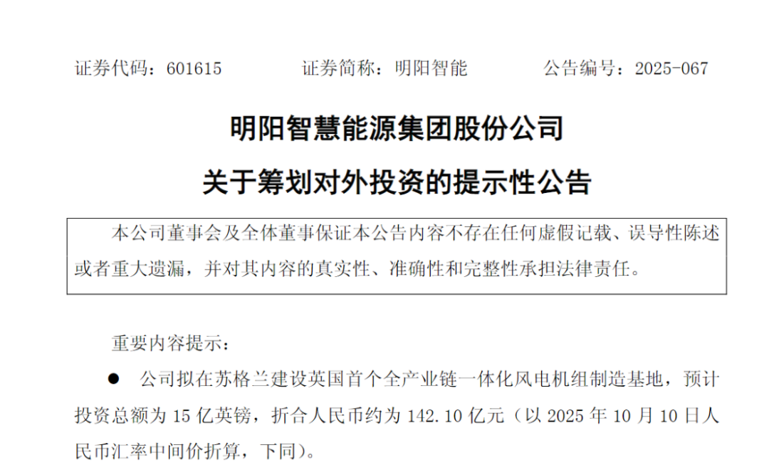 【导读】明阳智能拟142.1亿元投建英国首个全产业链一体化风电机组制造基地 中国基金报记者 闻言 10月12日晚间,明阳智能公告称,公司拟在苏格兰建设英国首个全产业链一体化风电机组制造基地,预计投资总额15亿英镑,折合人民币约142.10亿元。 这是明阳智能自2019年在上交所主板上市至今,首次宣布拟在海外投建超百亿元的风电项目。明阳智能公告称,海外市场潜力巨大。公司走向海外寻求新 的业务增长点,是积极推进国际化战略的重要一步。 截至10月10日收盘,明阳智能股价报16.82元/股,跌幅达2.66%,总市值为382.1亿元。 超142亿元投资拟分三个阶段进行 公告显示,明阳智能拟在苏格兰投建的项目,主要是计划建设海上与漂浮式风电机组制造工厂,并且预计分三个阶段进行。 明阳智能在项目第一期拟建设先进的风电机舱与叶片制造厂,计划2028年底实现首批投产;第二期拟扩建生产线,加速英国漂浮式风电技术的规模化生 产;第三期拟进一步扩展至控制系统、电子设备及其他关键部件的生产制造。 明阳智能公告称,本次投资可以将公司的海上风电技术引入北海区域,有助于加速漂浮式风电技术的商业化进程。公司漂浮式风电技术将对英国实现清洁 能源 ...