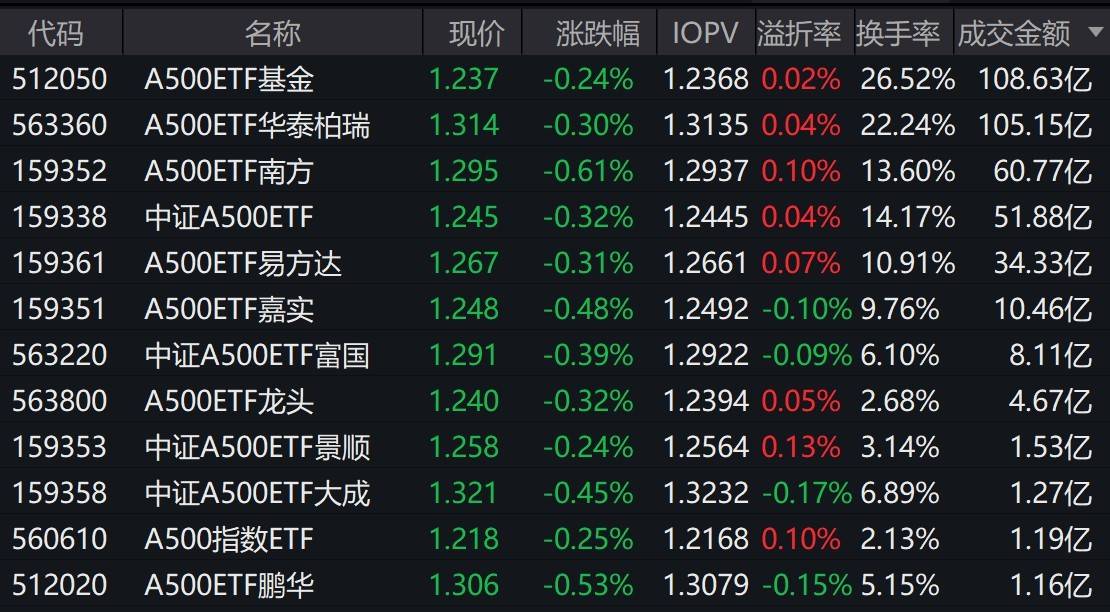 市场早盘冲高回落,中证A500指数下跌0.39%,2只中证A500相关ETF成交额超105亿元