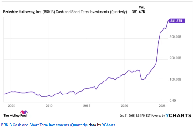 这些现金目前以短期美国国债形式持有,年化收益率仅为3.6%。这一决策释放出明确信号:在巴菲特 看来,当前股市的潜在回报率,已不足以覆盖这一无风险利率——更何况该利率水平仅略高于当前通胀 率。 巴菲特历次牛市中的操作轨迹 巴菲特从不直接公开评判股市整体走势及估值水平,但他的行动永远胜于雄辩。 智通财经APP获悉,伯克希尔·哈撒韦(BRK.A.US)目前持有的现金规模,已超过多家知名大型企业的总 市值。随着现金储备逼近4000亿美元大关,这家由即将卸任的沃伦・巴菲特执掌的综合企业集团正将这 笔资金投向美国国债这一避险资产,而与此同时,全球其他投资者却在狂热追逐人工智能(AI)概念股。 巴菲特究竟在向投资者传递什么信号?纵观其漫长的投资生涯,即使他未曾公开发表言论,其行动本身 已是对投资者发出的震耳警钟。随着这位传奇投资人确定于2026年初退休,当前举措或可视为其对华尔 街的最后警示。 下文将解析为何巴菲特的巨额现金储备值得高度关注,以及这一信号对2026年的投资者具有何种意义。 创纪录的现金储备 自2023年牛市开启以来,伯克希尔便持续积累现金。最新数据显示,其现金储备已从最初的1000亿美元 飙升至近4000亿 ...