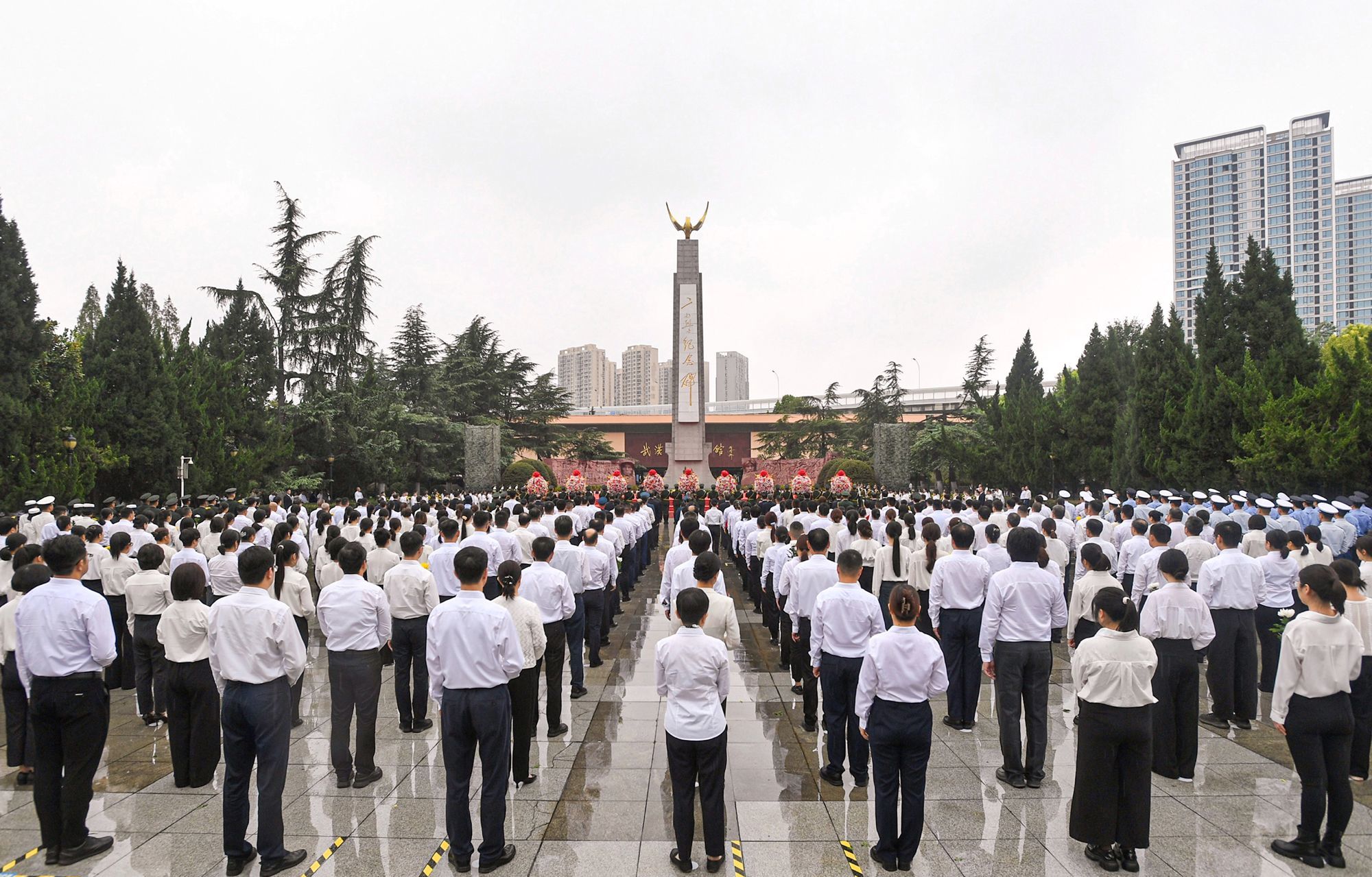 默哀毕,手持鲜花的少年儿童献唱《我们是共产主义接班人》,并致少年先锋队队礼。在深情的《献花曲》中,18名礼兵稳稳托举全 市各界敬献的花篮,正步前行,拾级而上,将花篮整齐摆放在烈士纪念碑前。 9月30日是我国第十二个"烈士纪念日"。武汉市党政军领导,各民主党派、人民团体负责人和全市各界群众代表,怀着无比崇敬的心情 来到武汉二七纪念馆,向英雄烈士敬献花篮,缅怀革命先烈、致敬人民英雄,传承红色基因、赓续红色血脉。 秋风寄哀思,鲜花献英烈。上午,苍松翠柏环绕的武汉二七纪念馆气氛庄重,烈士纪念碑巍然矗立。临近10时,省委常委、市委书记 郭元强,市委副书记、市长盛阅春,市人大常委会主任胡立山,市政协主席杨智,市委副书记孟祥伟等市领导依次入场,与烈士家属、退 役军人、劳动模范代表握手致敬。 10时许,《思念曲》奏响,深沉悠远。"礼兵就位!"随着号令,礼兵步伐铿锵、整齐划一,以正步肃穆行进至纪念碑前伫立。 仪式主持人盛阅春向烈士纪念碑行鞠躬礼,宣布敬献花篮仪式正式开始。雄壮高亢的《义勇军进行曲》奏响,全场齐声高唱中华人民 共和国国歌。国歌唱毕,全场肃立,向为中国人民解放事业和共和国建设事业英勇献身的烈士默哀。 郭元强迈步上前 ...