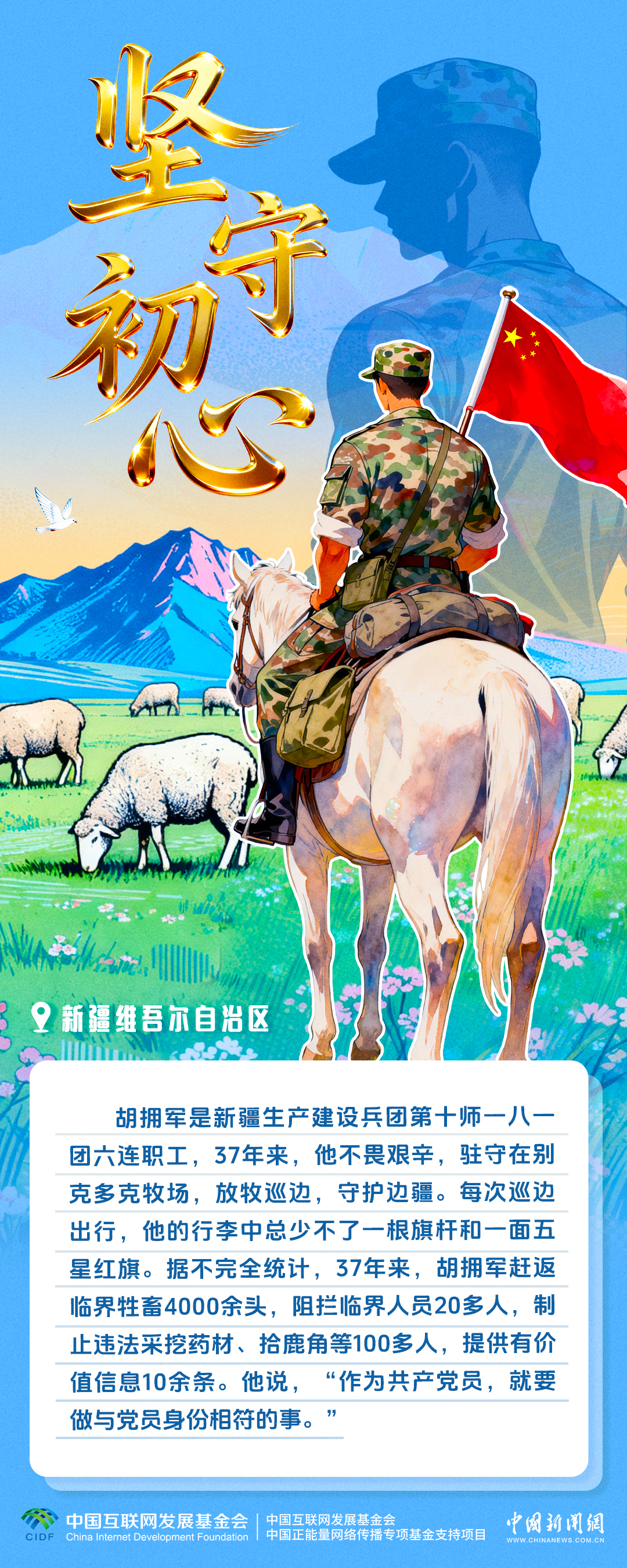 有一种红,叫"中国红"。它是五星红旗上最炽热的底色,也是中华儿女心中最滚烫的信仰。一面面飘扬的国旗之下,是无数个平凡而伟大的身影。他们同 在国旗下,用奉献书写家国情怀。 T n & F 亚II、The Andress And Press Press Press Press Press Press Press Press Press Press Press Productions Pr 日月江据处境派山川,主治丁土四四川 高的地域,平均海拔5373米,空气含氧量不足 平原的一半,被称为"生命禁区"。李天娇、 李红炎与武慧3名刚毕业的女警带着对成守边疆 的憧憬,主动请缨来到这片雪域。她们踏雪巡 逻、救助群众的身影,恰似迎风绽放的格桑 花,守护着这片土地上飘扬的五星红旗,用青 春诠释着最深沉的爱国情怀。 中国互联网发展基金会 | 中国互联网发展基金会 China Internet Development Foundation | 中国正能量网络传播专项基金支持项目 ♀ 新疆维吾示自治区 胡拥军是新疆生产建设兵团第十师一八一 团六连职工,37年来,他不畏艰辛,驻守在别 克多克牧场,放牧巡边,守护边疆。每次巡边 出行, ...