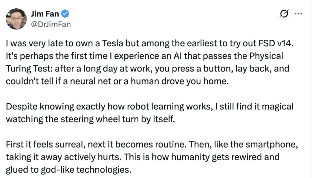 我入手特斯拉比较晚,但却是最早体验FSDv14的用户之一。这可能是我第一次真正感受到通过物理图灵测试的AI:结束一天漫长的工 作后,你只需按下一个按钮,放松地靠在座椅上,完全分不出开车的是神经网络还是真人司机。 Jim Fan表示,FSD带来的第一感觉是「不可思议」,并且很快就已经渗透进了他的生活,甚至开始有点「上瘾」。 一开始你会觉得这不太真实,然后它就成了日常。再然后,就像智能手机一样,一旦失去它,你就会非常难受。 这就是人类如何被重新塑造,并最终沉迷于技术。 Jay henry 发自 凹非寺 量子位 | 公众号 QbitAI 特斯拉FSD v14,首个通过「物理图灵测试」的AI。 为特斯拉「颁发」这一殊荣的并非别人,而是英伟达大名鼎鼎的机器人主管—— Jim Fan 。 平安夜前夕,这位英伟达Project GR00T的领军人物,在亲眼看到自家特斯拉的一路自主护送自己回家后,大受震撼: 当然,FSD v14.2.2不是独属于Jim Fan的专属礼物。在陆续收到新版FSD推送后,特斯拉车主们的反馈也迅速刷屏——一句话总结: 玩疯 了 。 特斯拉圣诞狂欢 首个得到英伟达机器人主管「背书」、被称为通过「物理图 ...