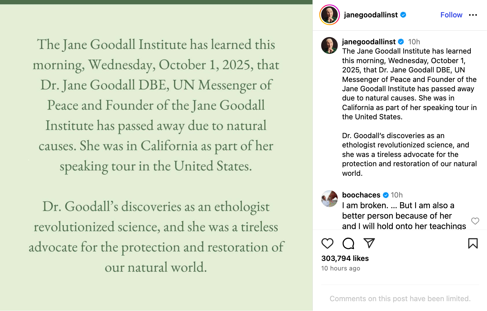 智通财经记者 | 王鹏凯 当地时间10月1日上午,美国洛杉矶,当地高中EF Academy的近800名师生和家长正在礼堂等待著名灵长类动物学家珍·古道尔的一场演讲开始,正在发言的 校长被手机提示打断,几分钟后,他宣布了古道尔离世的消息,台下一片愕然。这则消息来自珍·古道尔研究所,据悉,古道尔因"自然原因"去世,终年91 岁。 智通财经编辑 | 姜妍 图片来源:珍·古道尔研究所Instagram主页 这是一个很突然的消息,对很多人来说,古道尔的生命从未有停止的迹象,即使在晚年,古道尔仍保持着高强度的工作节奏,她每年有300天要在全球各地 演讲,从印度、马来西亚到中国,再到新加坡、尼泊尔、美国,世界各个角落都能见到她的身影。如今回看,这一切似乎带着一种生命尽头的紧迫感,她几 乎不给自己留任何休息时间,迫切地想向更多人宣讲环境保护的重要性,宣讲希望的力量。 很难用只言片语来概括古道尔对世界的影响。她是动物行为学博士,曾为科学界带来突破性变革,也是世界上最知名的自然保护主义者之一,联合国和平使 者,一位全球偶像。 2024年11月底,珍·古道尔第17次到访中国,在北京的五天时间里,她参加了近10场公开活动,所到之处形 ...