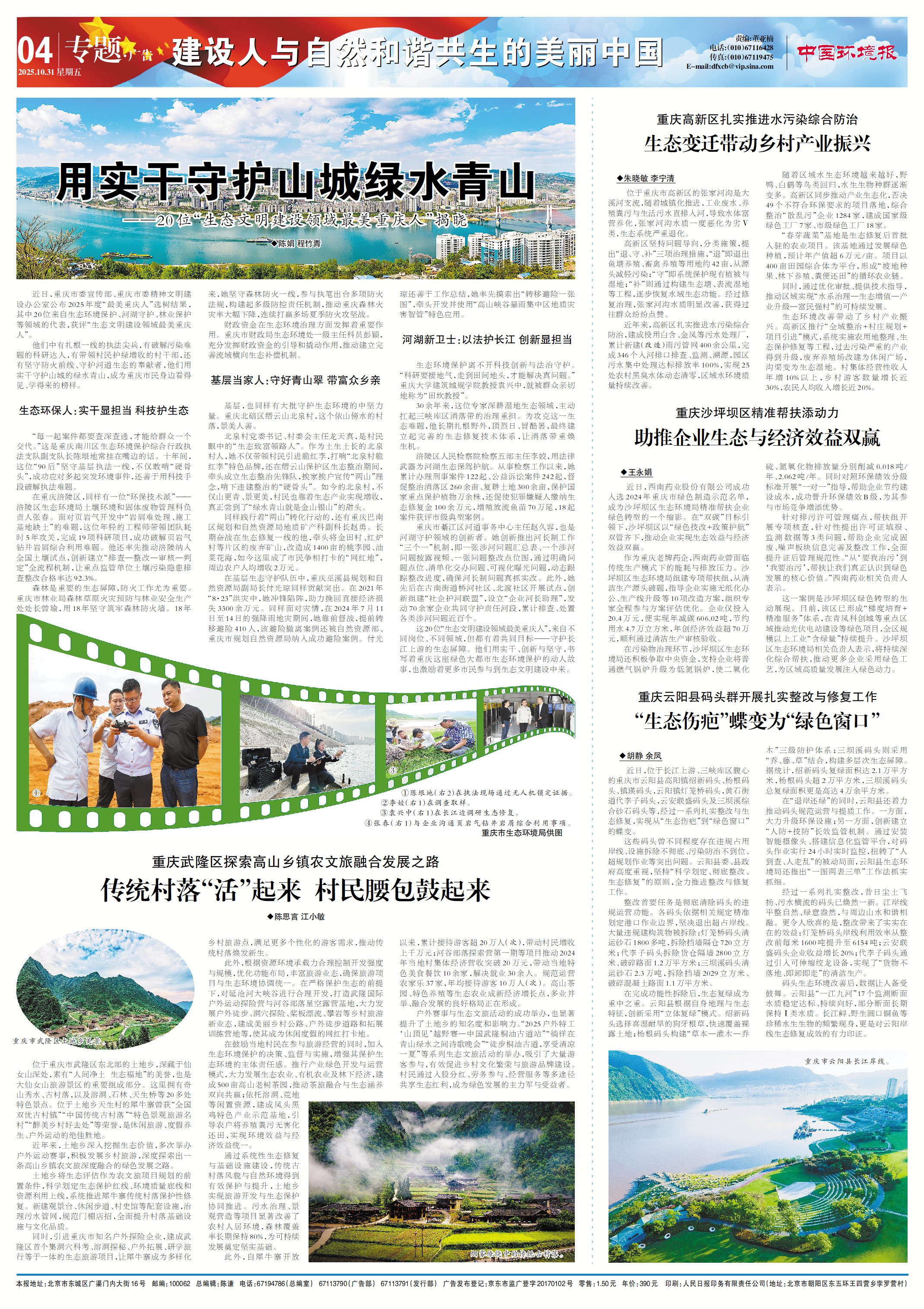 近日,重庆市委宣传部、重庆市委精神文明建 设办公室公布2025年度"最美重庆人"选树结果, 其中20位来自生态环境保护、河湖守护、林业保护 等领域的代表,获评"生态文明建设领域最美重庆 人"。 他们中有扎根一线的执法尖兵,有破解污染难 题的科研达人,有带领村民护绿增收的村干部,还 有坚守防火前线、守护河道生态的奉献者,他们用 实干守护山城的绿水青山,成为重庆市民身边看得 见、学得来的榜样。 生态环保人:实干显担当 科技护生态 "每一起案件都要查深查透,才能给群众一个 交代。"这是重庆南川区生态环境保护综合行政执 法支队副支队长陈垠地常挂在嘴边的话。十年间, 这位"90后"坚守基层执法一线,不仅敢啃"硬骨 头",成功应对多起突发环境事件,还善于用科技手 段破解执法难题。 在重庆涪陵区,同样有一位"环保技术派" -- 涪陵区生态环境局土壤环境和固体废物管理科负 责人张春。面对页岩气开发中"岩屑难处理、施工 基地缺土"的难题,这位年轻的工程师带领团队耗 时5年攻关,完成19项科研项目,成功破解页岩气 钻井岩屑综合利用难题。他还率先推动涪陵纳入 全国土壤试点,创新建立"排查一整改一审核一判 定"全流程机制,让重点监管 ...