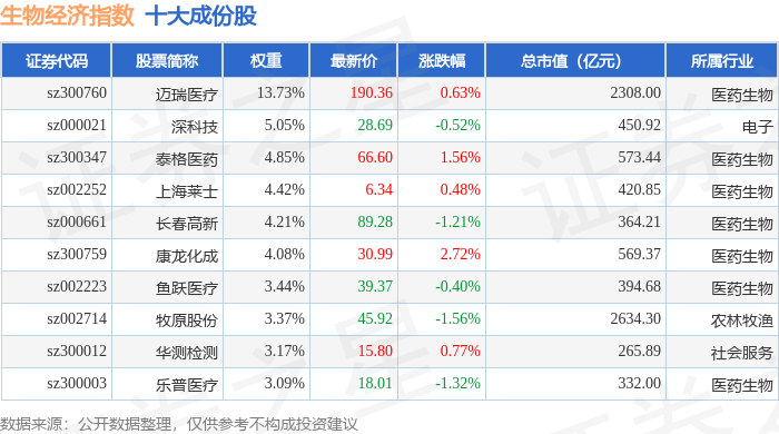 生物经济指数市场表现 - 1月21日,生物经济(970038)指数报收于2249.37点,上涨0.3%,当日成交额为272.77亿元,换手率为2.27% [1] - 指数成份股中,上涨家数为28家,其中迪安诊断以5.59%的涨幅领涨;下跌家数为22家,其中康弘药业以1.78%的跌幅领跌 [1] 十大权重成份股详情 - 迈瑞医疗为指数第一大权重股,权重为14.57%,最新股价为195.30元,下跌0.86%,总市值为2367.90亿元 [1] - 深科技在十大权重股中涨幅最大,当日上涨3.65%,最新股价为32.64元,权重为4.14%,总市值为513.00亿元 [1] - 牧原股份在十大权重股中跌幅最大,当日下跌1.22%,最新股价为46.27元,权重为3.90%,总市值为2527.62亿元 [1] - 十大权重股中,医药生物行业公司占据主导,包括迈瑞医疗、泰格医药、长春高新、康龙化成等 [1] 成份股资金流向 - 生物经济指数成份股当日整体呈现主力资金净流入,合计净流入4.23亿元;游资资金合计净流入1.86亿元;散户资金合计净流出6.09亿元 [3] - 深科技获得主力资金净流入最多,达1.87亿元,主力净流入占比为3.06%;同时,其游资净流出9441.13万元,散户净流出9272.83万元 [3] - 沃森生物主力资金净流入6444.78万元,主力净流入占比高达8.62%,但其游资和散户资金均呈净流出状态 [3] - 中粮科技主力资金净流入5427.62万元,主力净流入占比为9.84%,游资小幅净流入491.65万元,但散户净流出5919.27万元 [3] - 舒泰神获得游资净流入3681.47万元,游资净流入占比为6.33%,同时主力资金净流入3085.17万元,但散户净流出6766.63万元 [3]