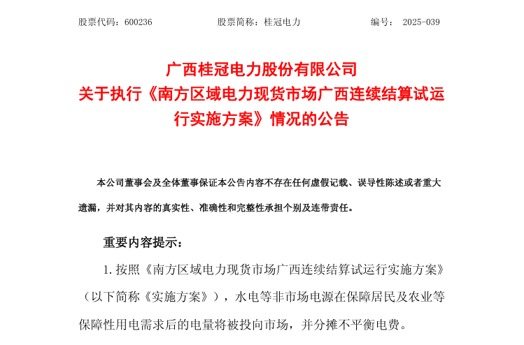 智通财经见习记者 | 张雨薇 桂冠电力(600236.SH)的一纸公告,暴露出发电企业在电力现货市场运行中将经历的"阵痛"。 桂冠电力日前公告称,按照《南方区域电力现货市场广西连续结算试运行实施方案》(下称《方案》),水电等非市场电源在保障居民及农业等保障性用电 需求后的电量将被投向市场,并分摊不平衡电费。 根据广西电网公司出具的三季度电费结算单,桂冠电力所属广西自治区内十家统调水电企业,三季度因分摊不平衡电费减少收入4.59亿元,减少归母净利润 3.27亿元,占上一会计年度净利的14.3%。 据智通财经梳理,这是首家公开表示利润受到不平衡电费影响且公布具体金额的上市公司。 图片来源:桂冠电力公告 发生上述现象的一大背景是,南方区域电力现货市场于今年6月29日进入连续结算试运行。 这类不平衡资金在不同的省份有不同的叫法,如山西的"市场平衡类费用",如山东的"结构类偏差费用",广东的"市场平衡类返还电费"。 按照山西电力市场过往的统计数据看,不平衡资金占市场运营费用的比例超过30%。 6月20日,广西电力交易中心、广西电网电力调度控制中心印发实施方案,规定广西自治区内水电等非市场电源,在超出电网企业保障性购电的 ...
