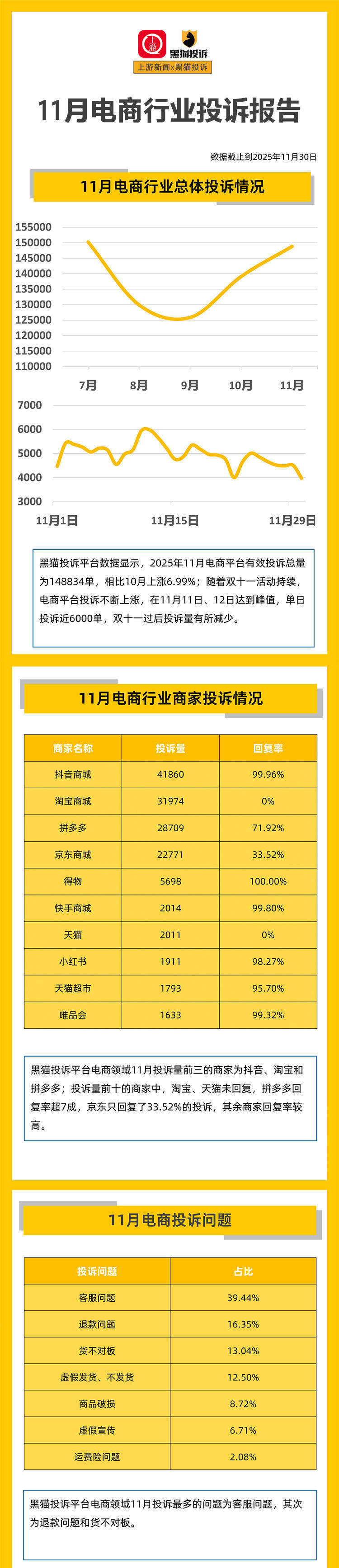 上游×黑猫 | 11月电商投诉报告:抖音投诉量第一,淘宝超3万件投诉回复率为零