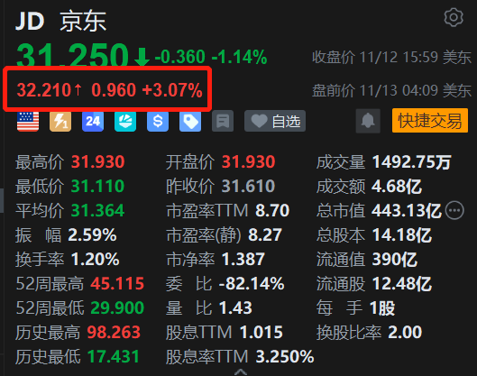 | JD 京东 | | | | --- | --- | --- | | 31 250 4 -0.360 -1.14% | | 收盘价 11/12 15:59 美东 | | 32.210 ↑ 0.960 +3.07% | | 盘前价 11/13 04:09 美东 | | 三 71 24 华 S 9 目 ♥ 白选 | | ● 快捷交易 | | 最高价 31.930 | 开盘价 31.930 | 成交量 1492.75万 | | 最低价 31.110 | 昨收价 31.610 | 成交额 4.68亿 | | 平均价 31.364 | 市空率 8.70 | 总市值 443.13亿 (…) | | 振 幅 2.59% | 市盈率(静) 8.27 | 总股本 14.18亿 | | 换手率 1.20% | 市净率 1.387 | 流通值 390亿 | | 52周最高 45.115 | 委 比 -82.14% | 流通股 12.48亿 | | 52周最低 29.900 | 量 比 1.43 | 色 主 1股 | | 历史最高 98.263 | 股息TTM 1.015 | 换股比率 2.00 | | 历史最低 17.431 | ...