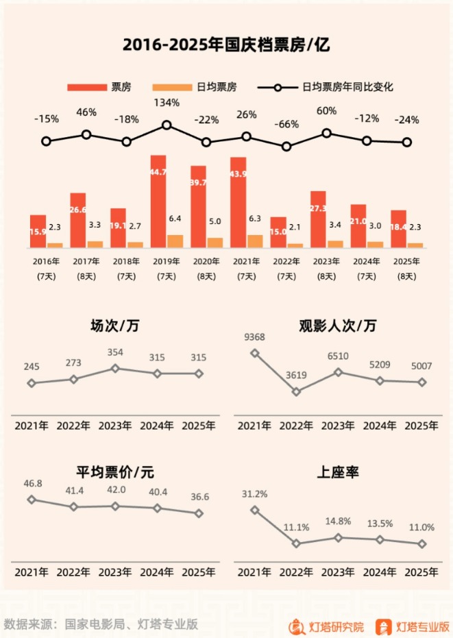 (原标题:缺乏爆款:电影国庆档同比下跌2.7亿元丨消费一线) 21世纪经济报道记者 贺泓源 电影国庆档冷淡收场。 据国家电影局数据,2025年国庆档电影票房同比下降13%至18.35亿元。作为对比,2021-2024年国庆档票房依次为43.88亿元、14.97亿元、27.35亿 元、21.05亿元。今年国庆档票房同比下跌2.7亿元,规模处于近五年倒数第二。 此影片来看,今年国庆档国产影片票房占比为98.93%。档期内票房前5名影片分别为:《志愿军:浴血和平》4.50亿元,《731》3.45亿元,《刺 杀小说家2》2.95亿元,《浪浪人生》2.19亿元,《震耳欲聋》1.75亿元。 这是近五年来,首次国庆档内无影片票房过5亿元。 爆款缺乏下,电影市场正走向更被动的局面。 还需看到,今年国庆档堪称"最划算"一年。 猫眼专业版数据显示,今年国庆档平均票价下调至近5年最低至36.6元。10月4日,新片集体降价。但仅《浪浪人生》降价后人次连续3日小幅增 长,部分影片单日票价环比降幅超9%,却未能带动人次增长。 此外,一线城市观影热情持续下滑。 灯塔数据显示。在今年国庆档,一线城市票房占比仅13.4%,创下历史新低。作为对 ...