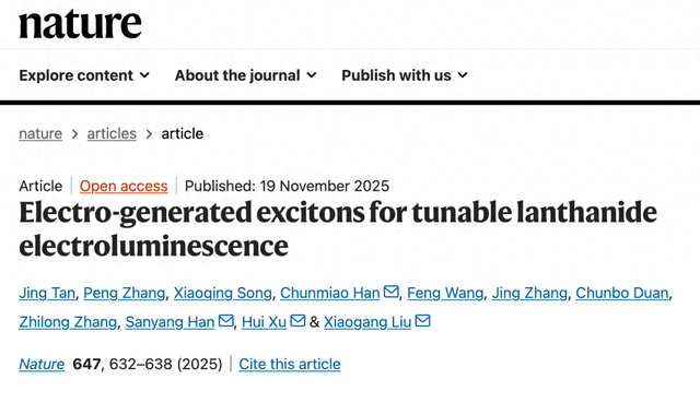 编辑丨王多鱼 排版丨水成文 镧系纳米晶 在电致发光 ( Electroluminescence, EL) 应用中具有独特优势,包括窄带发射、高色纯度和组分可调的发光输出。然而,其绝缘特性对载流子的 传输与注入提出了挑战,阻碍了它们在电驱动光电器件中的应用。 2025 年 11 月 19 日, 黑龙江大学化学与材料科学学院 许辉 教授、 韩春苗 教授,清华大学深圳国际研究生院 韩三阳 副教授及 新加坡国立大学 刘小刚 教授团 队合作,在国际顶尖学术期刊 Nature 上发表了 题为: Electro-generated excitons for tunable lanthanide electroluminescence 的研究论文,黑龙江大学为该 论文第一单位,据悉,这也是黑龙江大学校史首篇 Nature 论文。 该研究实现了 镧系纳米晶 (NaGdF₄:X) 在 电致发光器件 中的应用研究突破,通过功能化配体设计克服材料绝缘性挑战,实现高效多色发光调控。 在这项最新研究中,研究团队展示了一种基于绝缘性镧系氟化物纳米晶 (4 nm;NaGdF₄:X;X = Tb³⁺、Eu³⁺或Nd³⁺) 的高效电致发光策略 ...